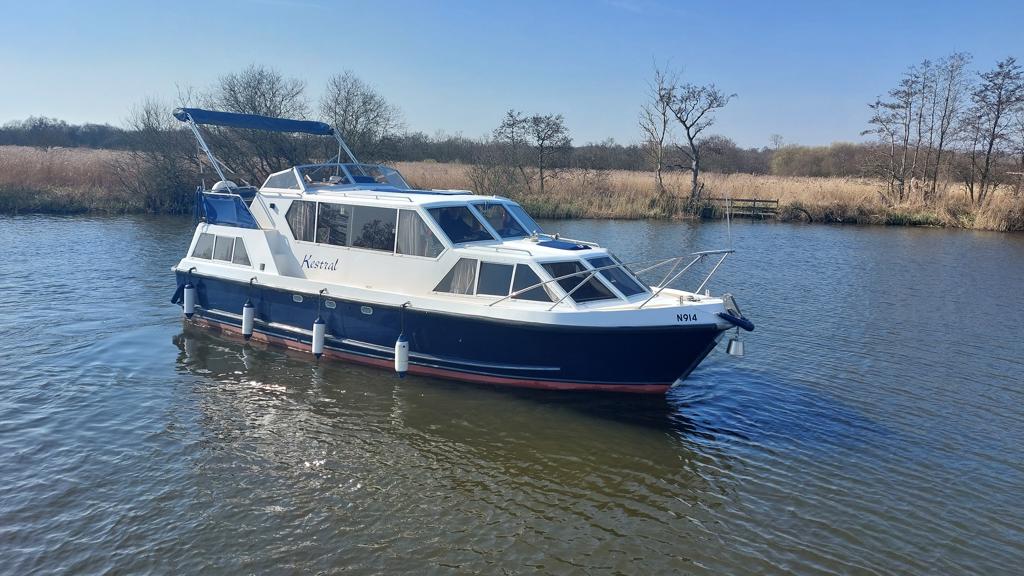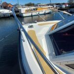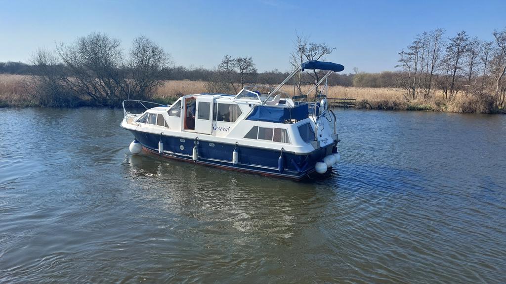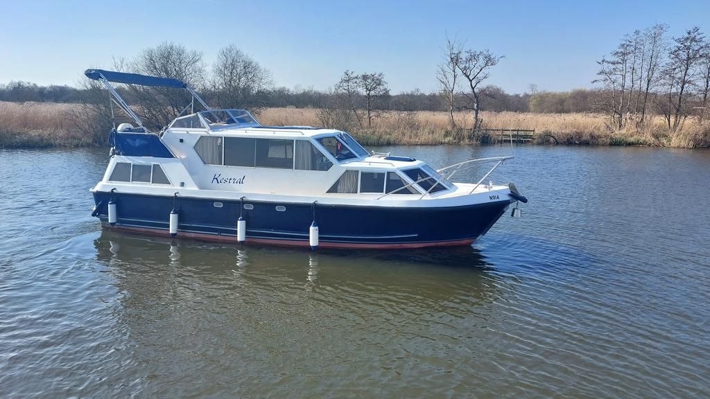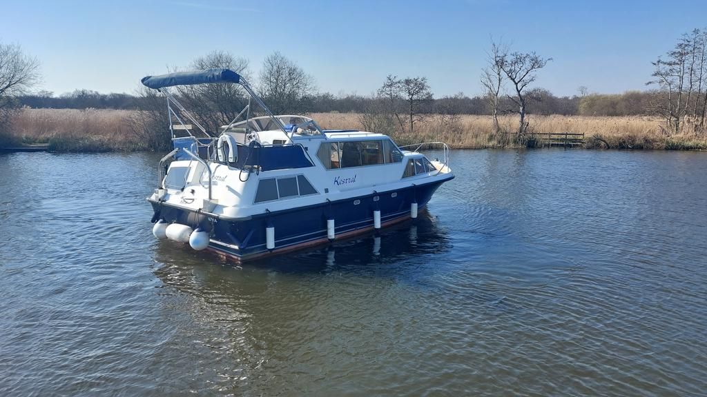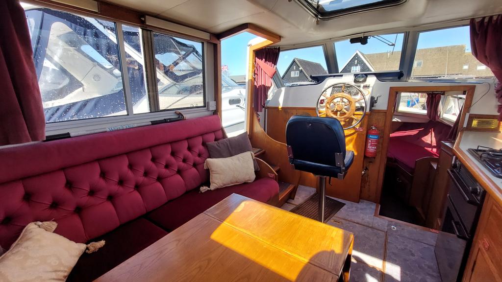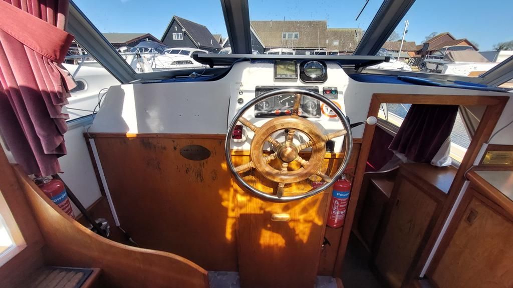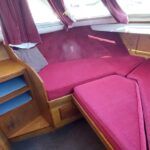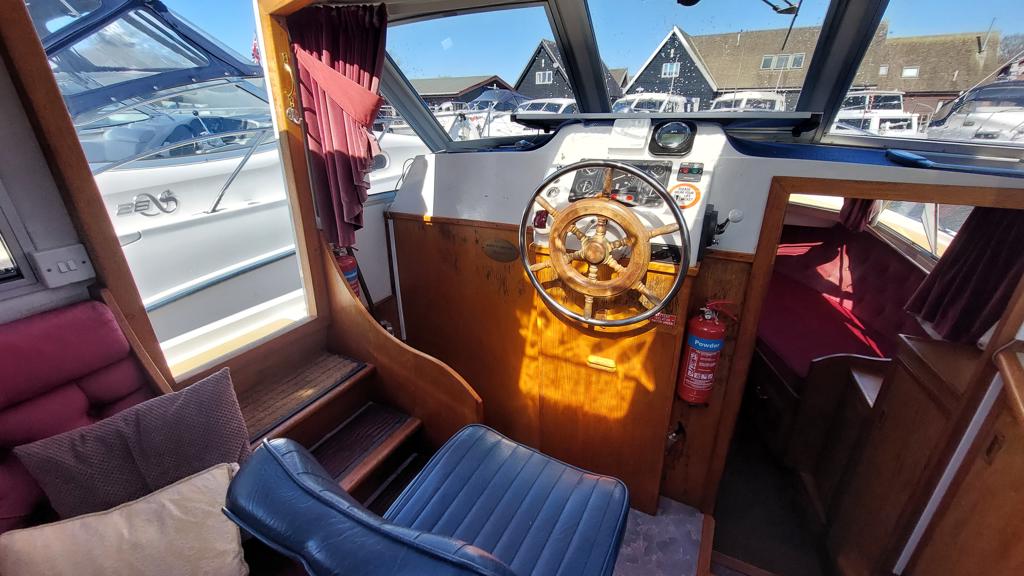 Alpha 29 Dual Steer – 1992 – Single BMC 1.8 ltr 52bhp diesel engine through a shaft. 4 berth accommodation across three cabins with 2 toilet/shower compartments. Specification to include; bow thruster, warm air heating, folding windscreens, bimini cover, electric windlass. “Kestrel” offers a lot of accommodation in a 29ft boat and would make an ideal craft on which to explore the broads. Folding windscreens give her access under most Broads bridges.