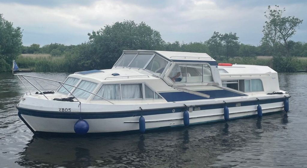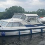 ALPHA 35 – 1984 – Powered by a Nanni N43 43hp diesel engine (new 2014). 4 berth accommodation in two cabins with 2 x toilet/shower compartments.  Specification including Bow thruster new 2019 , shore power, inverter, battery charger, calorifer with immersion heater, warm air heating, new hydraulic steering fitted in 2019, raised driving position with sliding roof reducing air draft to under 7ft! BSC 03/22. A comfortable river cruiser, ideal for extended inland cruising with the family.
