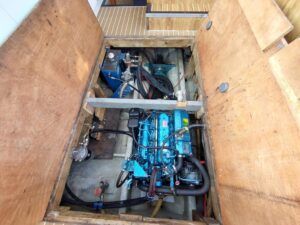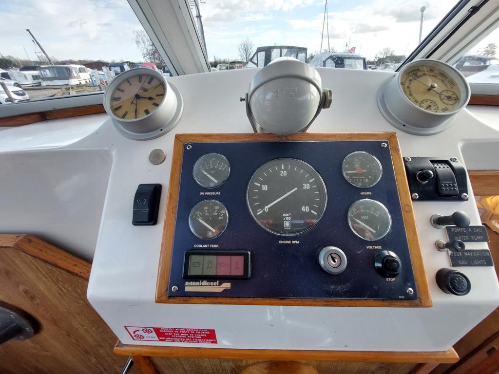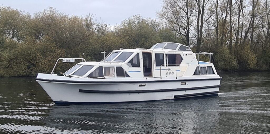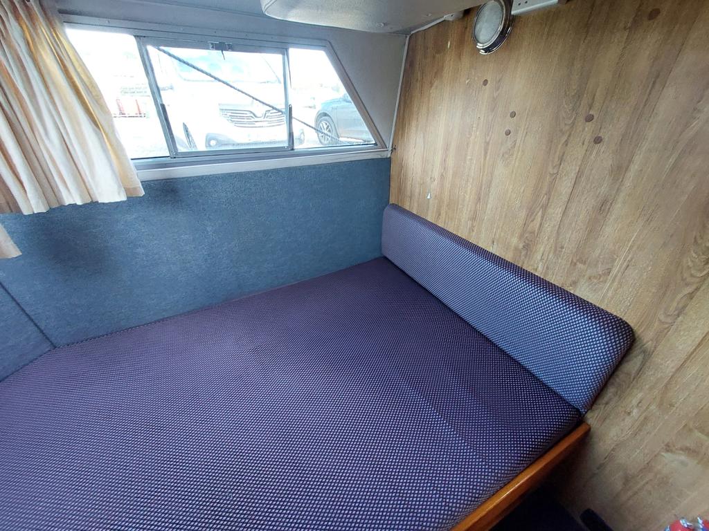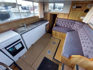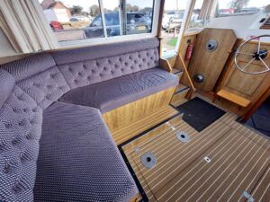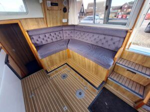 Alpha Craft 29 Dual Steer – 1990 – Powered by a Nanni 42hp diesel engine. 4 berth accommodation with two en-suite cabins (one with sit bath). New fitted galley in 2023 including new cooker, worktops, units and sink. Fitted with Warm air heating, shore power, calorifier, window covers, teak and holly effect flooring to saloon/galley, folding windscreens for increased access on the inland waterways. Fully prepped in 2023. An incredible amount of family accommodation all within 29ft.