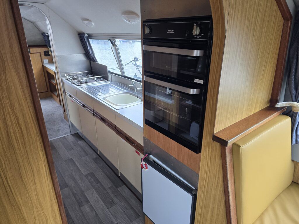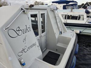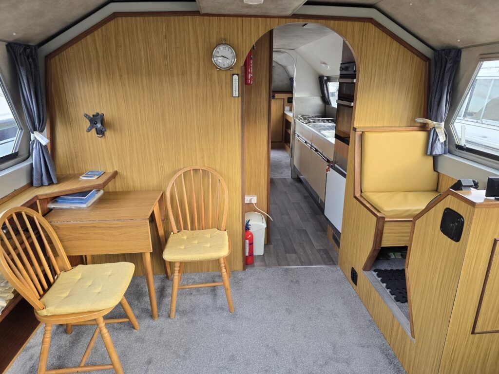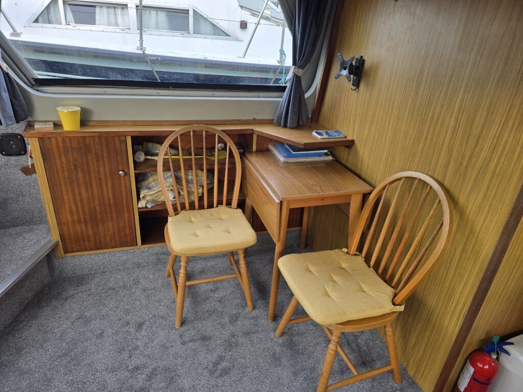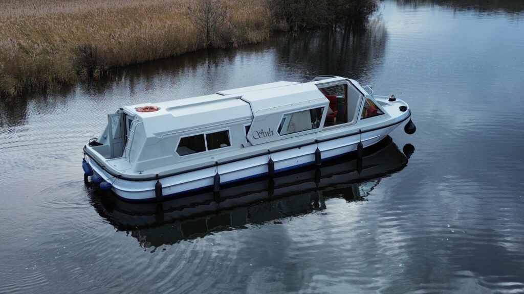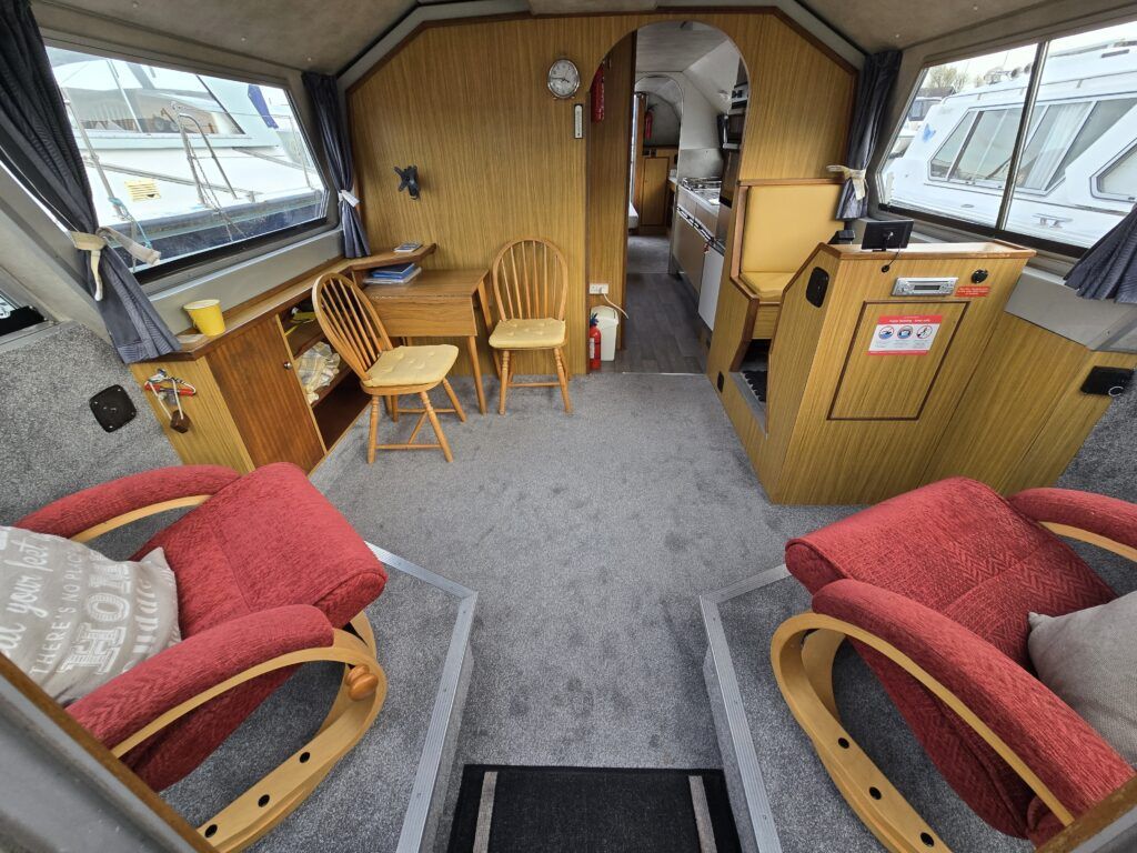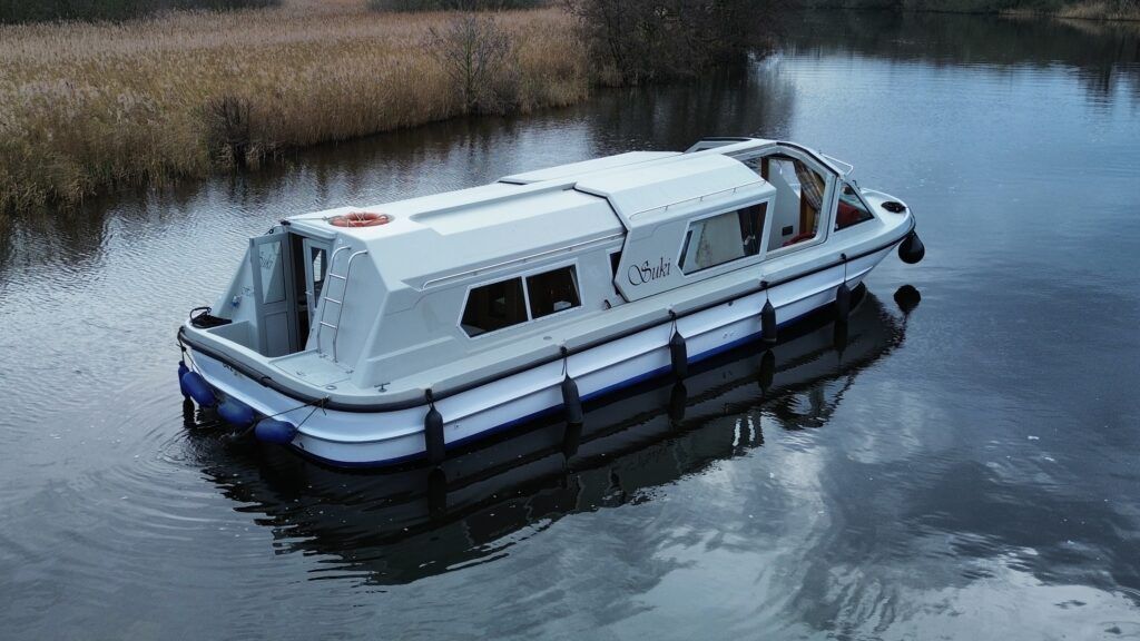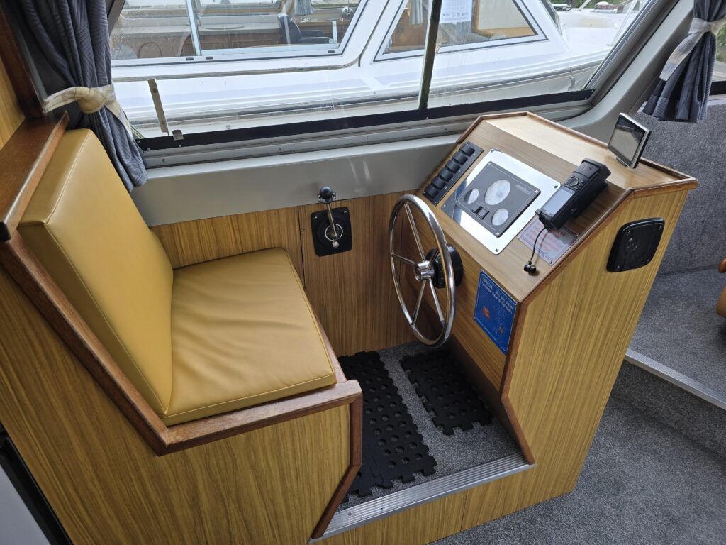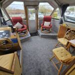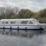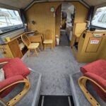 Alphacraft 34 – 1994 – Powered by a Nanni N4.38 38hp diesel engine through a shaft drive. A highly desirable two-berth layout, featuring a spacious island double aft cabin with an en-suite bathroom, including a toilet and a shower/bath. Specification includes: inverter, immersion heater, battery charger, warm air heating, and a full galley with a new cooker. Fitted with three new batteries and antifouled in 2025. “Suki” offers generous space for a couple wishing to explore the inland waterways in comfort, and benefits from a Nanni diesel engine with just 318 hours.