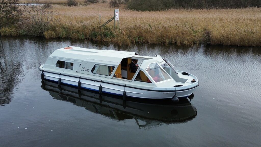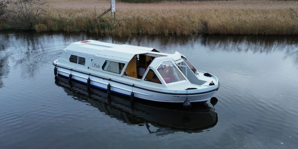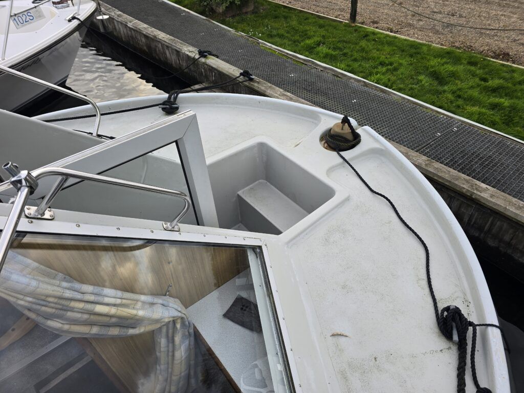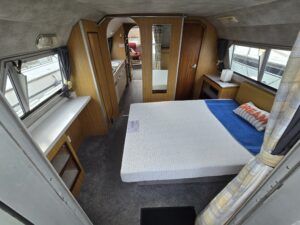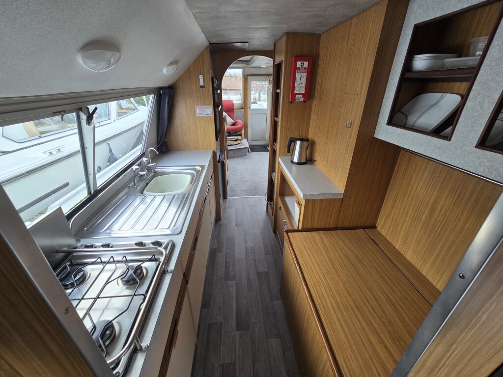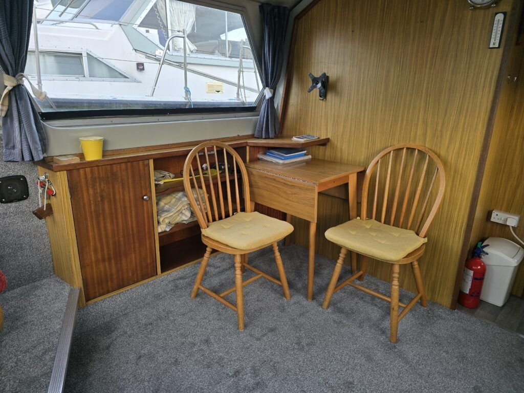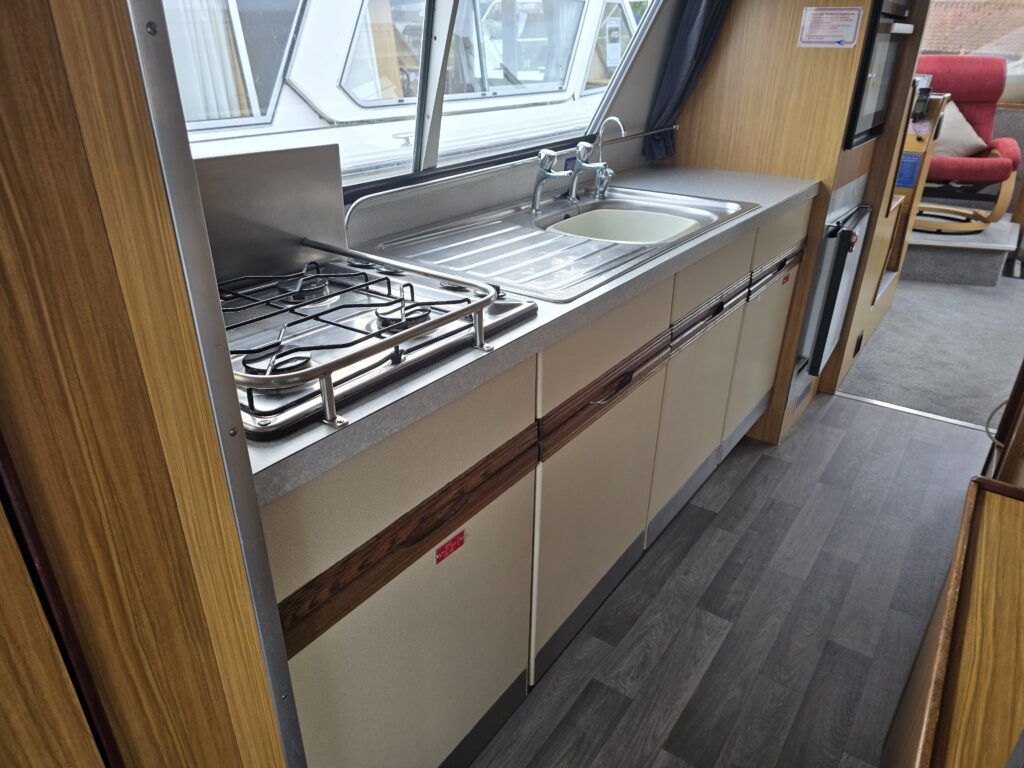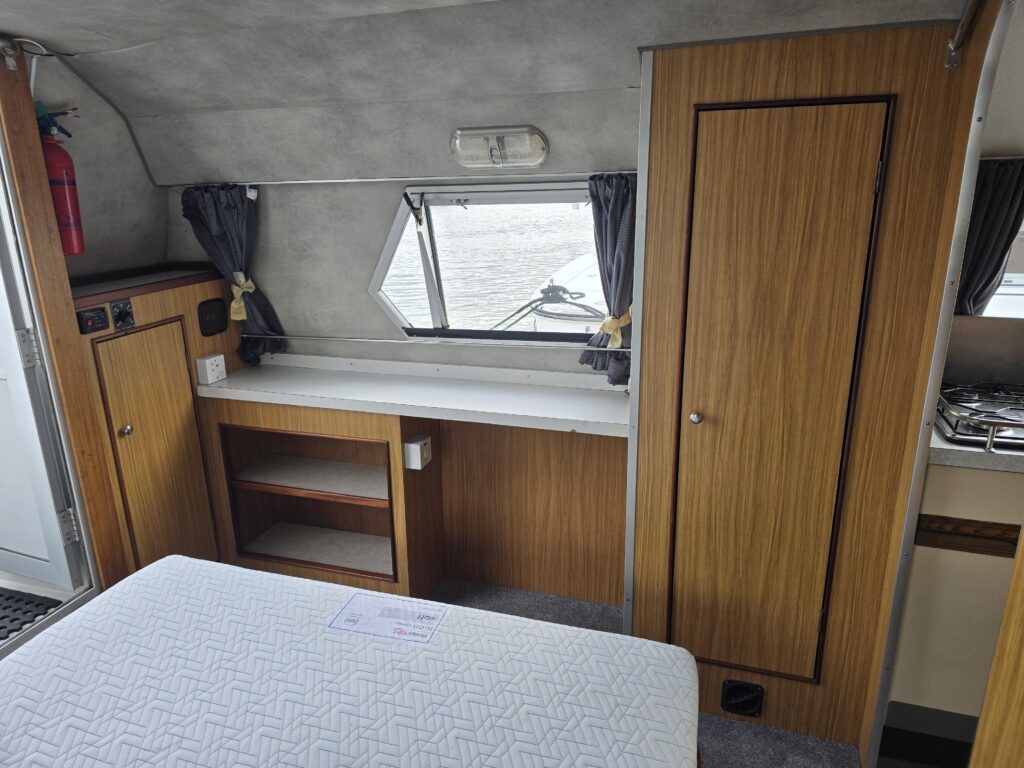 Alphacraft 34 – 1994 – Powered by a Nanni N4.38 38hp diesel engine through a shaft drive. A highly desirable two-berth layout, featuring a spacious island double aft cabin with an en-suite bathroom, including a toilet and a shower/bath. Specification includes: inverter, immersion heater, battery charger, warm air heating, and a full galley with a new cooker. Fitted with three new batteries and antifouled in 2025. “Suki” offers generous space for a couple wishing to explore the inland waterways in comfort, and benefits from a Nanni diesel engine with just 318 hours.