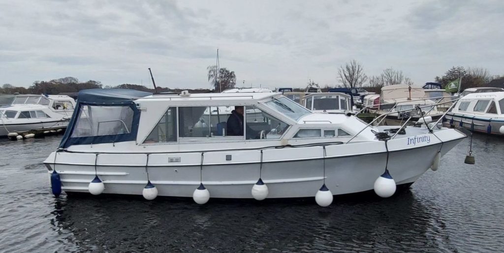 Aquabell 28 – 1980 – Single Nanni 38hp diesel engine with an hydraulic drive. Four berth accommodation with a single toilet/shower compartment. Specification to include; shore power, speed log, warm air heating, DAB radio/CD player, electric windlass, holding tank. “Infinity” offers flexible, practical accommodation, a low air-draft allowing passage through most Broads bridges and would make a perfect boat on which to explore the Broads. BSC 29/03/27