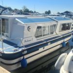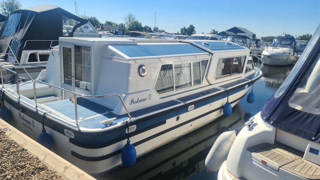 AQUAFIBRE 28 – 1991 – Perkins 4108 Diesel engine on hydraulic shaft drive , 4 berth accommodation. ardic diesel warm air heating, toilet to holding tank, 12v/gas fridge, shower, shorepower, inverter, rediline generator,  Boat safety certificate until may 2025 , 1 owner from new and cruised on the Norfolk Broads,  A very popular river cruiser, offering a low air draft and spacious accommodation.