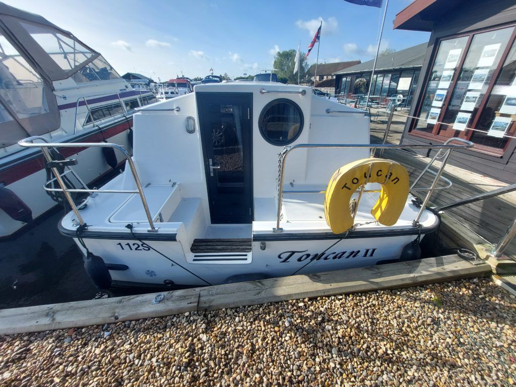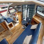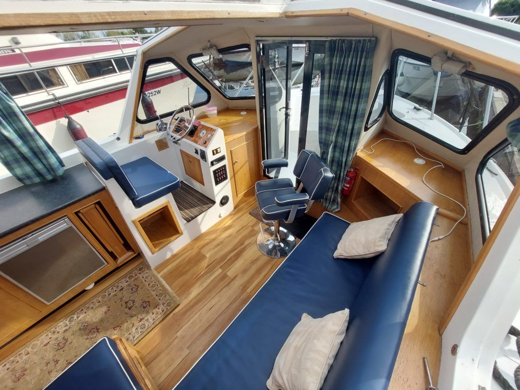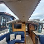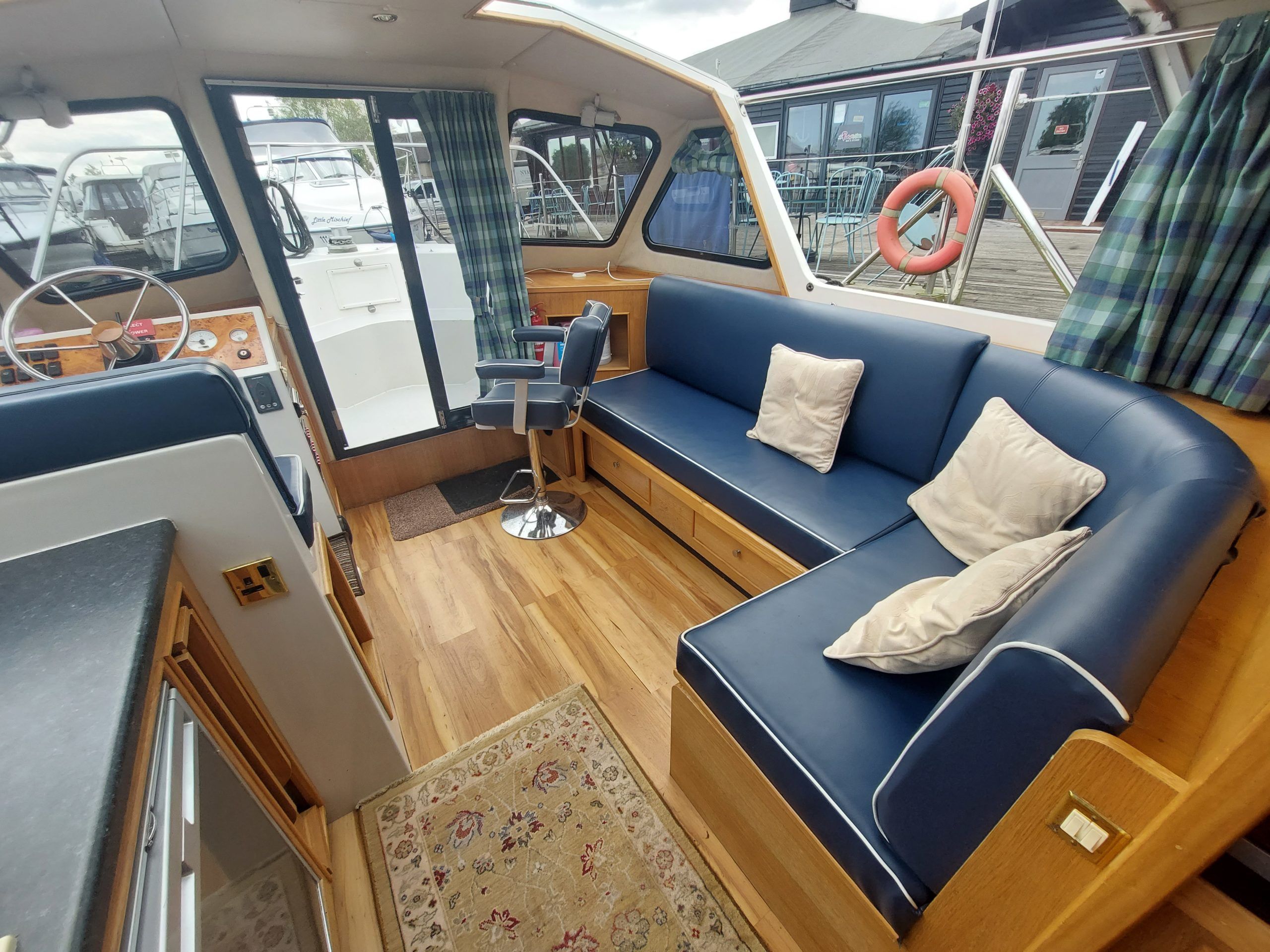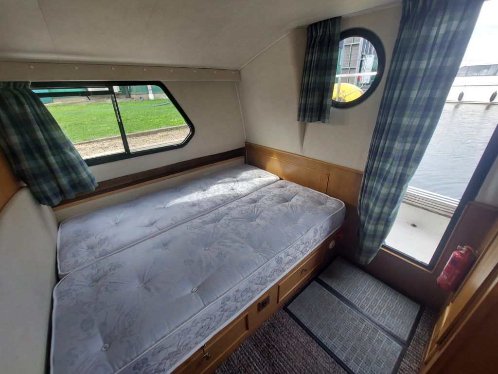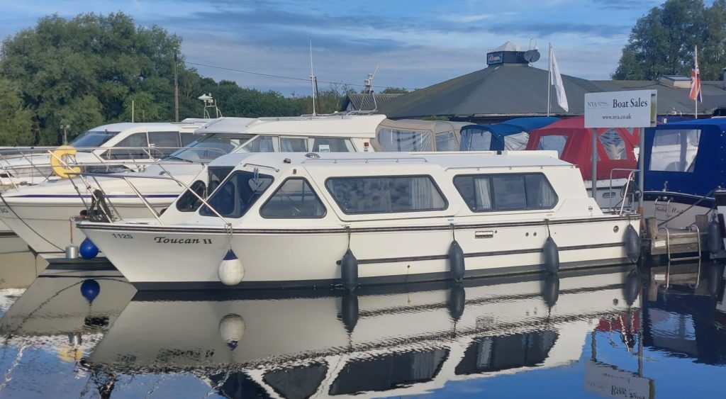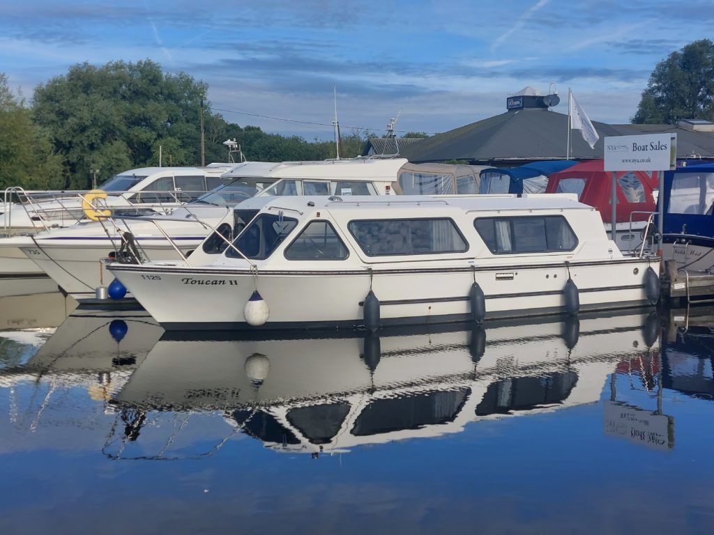 Aquafibre 28 Opal – 2009 – Single Nanni 4.38HE 38hp diesel engine through a shaft. 4 berth accommodation with a single electric toilet/shower compartment. Specification to include; bow and stern thrusters, electric anchor windlass, warm air heating, inverter, split sliding roof, full galley. “Toucan” is a well equipped version of these popular river cruisers, ideal for exploring the Broads. BSC 04/2025