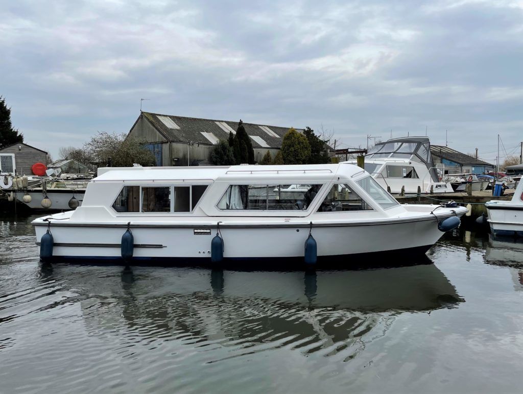 AQUAFIBRE 28 OPAL – 1994 – Powered by a single Nanni 4.150HE 38hp diesel through a shaft – 4 berth accommodation with W/C and shower. Specification to include; Webasto warm air heating, holding tank, Waeco Sinepower SP300 inverter, shore power supply with battery charger and 240v sockets. Split sliding saloon roofs. A low air draft river cruiser with single diesel economy and shaft set up! NYA stock presented in fantastic order throughout, a really good example benefitting from a recent full machine compound and polish, antifoul and full mechanical inspection! also offered with 3 month major mechanical failure warranty on the engine and gearbox!