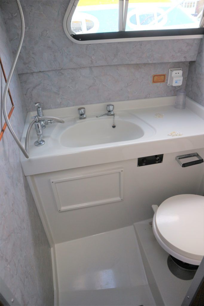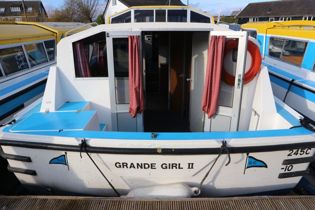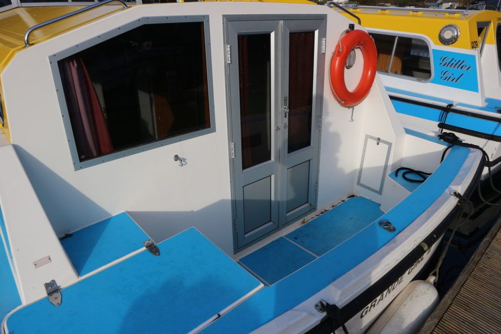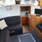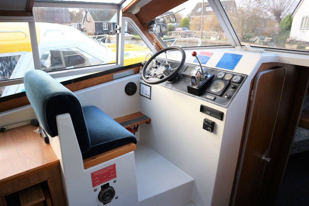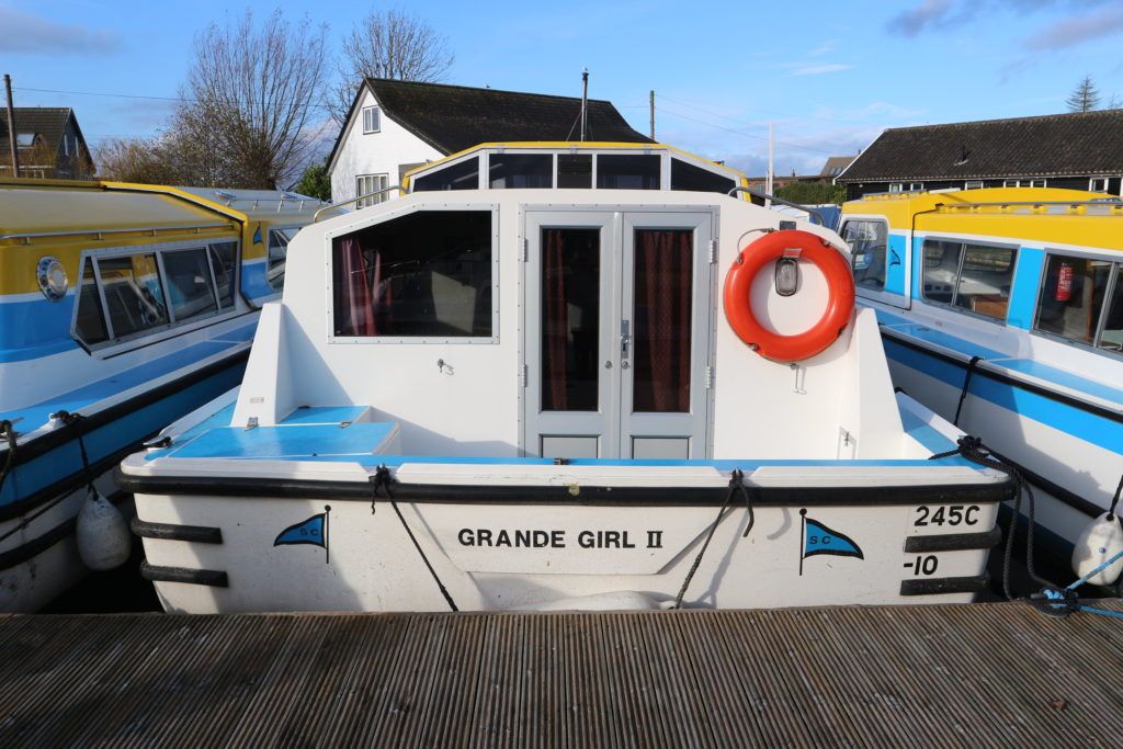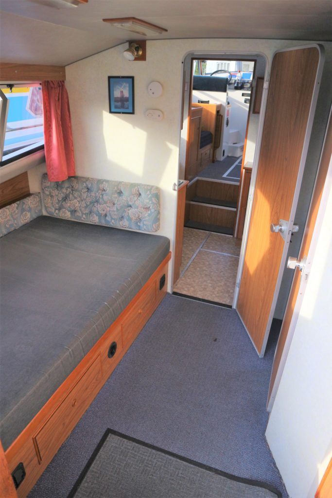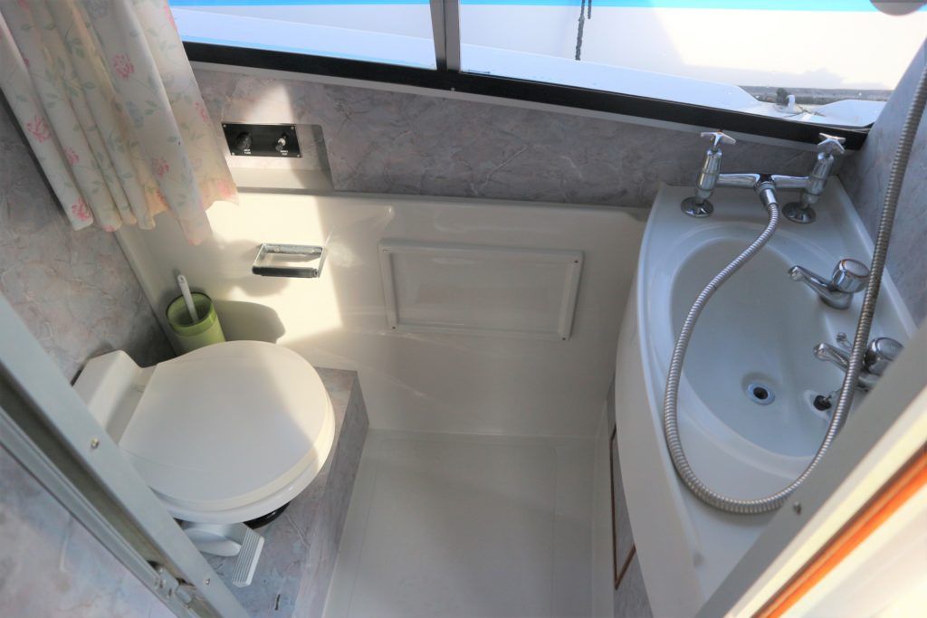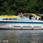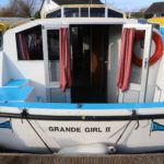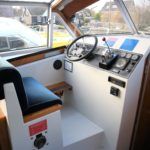 AQUAFIBRE PEARL 38 – 1996 – Powered by a Nanni 6.280HE 59hp diesel engine. Built by Brister craft. 5 berth accommodation over 3 cabins and saloon with 2 x toilet/shower compartments, one being en-suite. Full width fitted galley with 4 burner hob, oven, grill, fridge & microwave. Specification including Bow thruster, shore power, battery charger, inverter, depth log, warm air heating, winch operated sliding canopy with side door, folding screens. A well fitted family cruiser with a spacious raised central saloon and large galley, ideal for extended cruising. A great opportunity to acquire a well cared for ex hire cruiser.