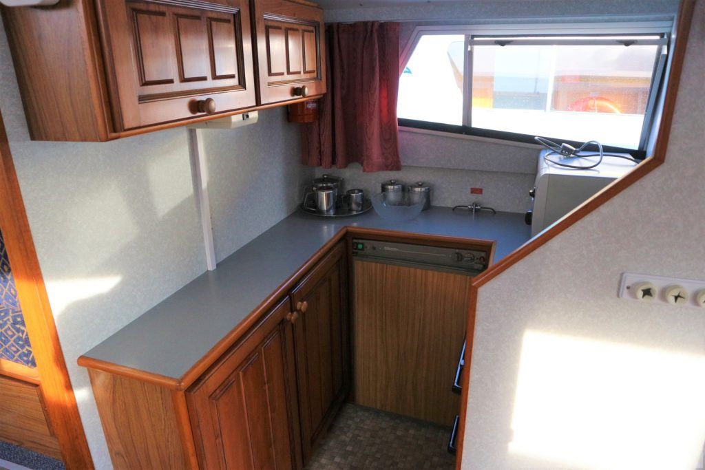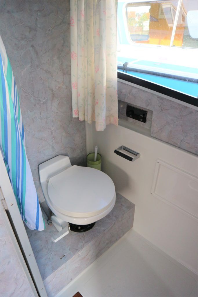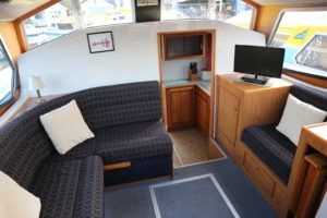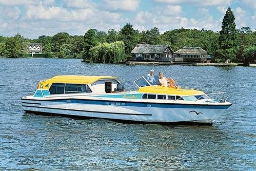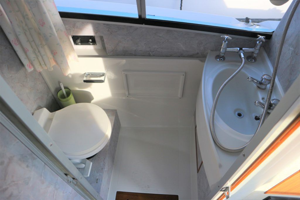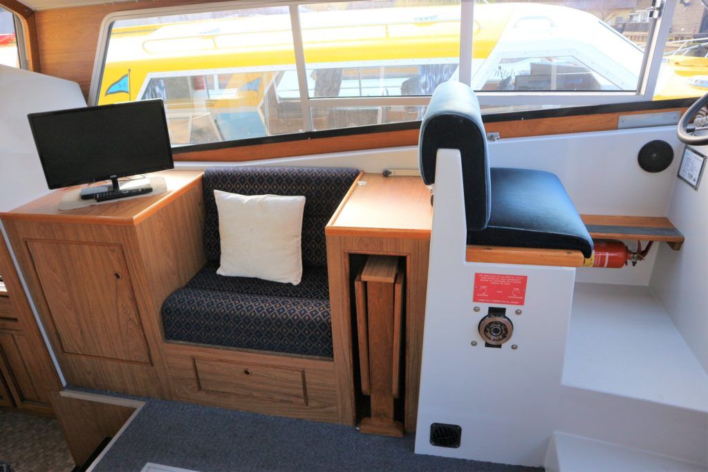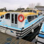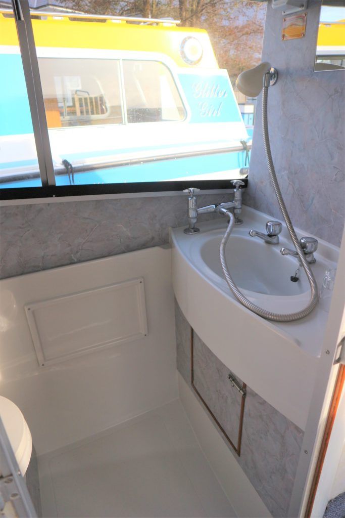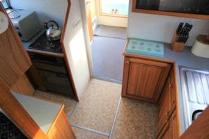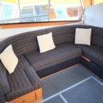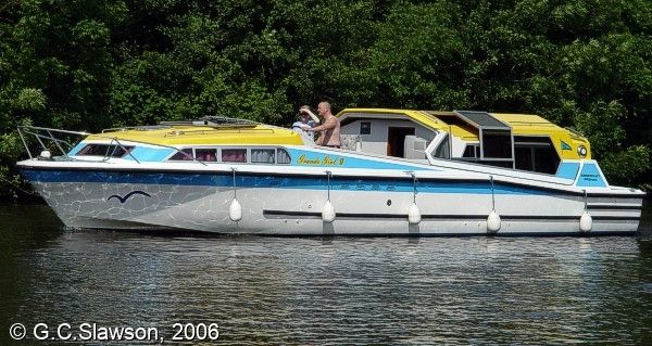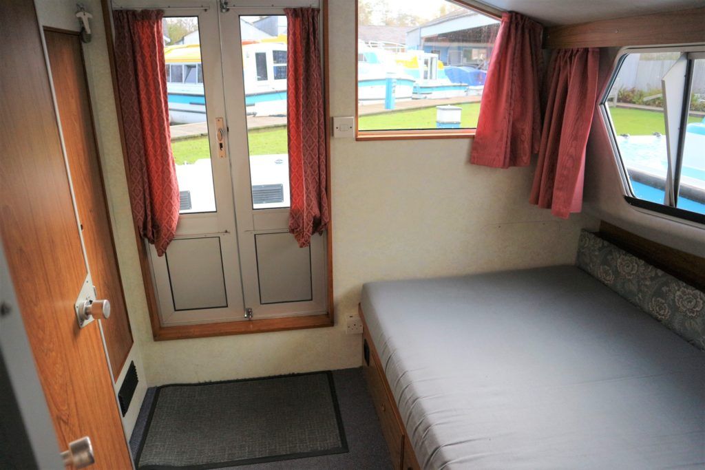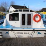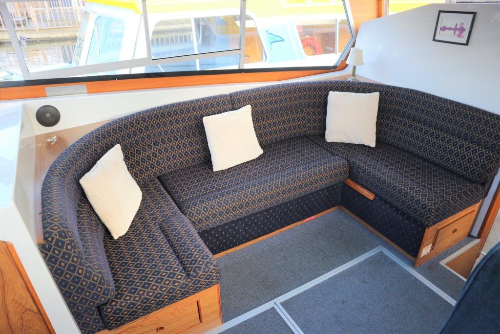 AQUAFIBRE PEARL 38 – 1996 – Powered by a Nanni 6.280HE 59hp diesel engine. Built by Brister craft. 5 berth accommodation over 3 cabins and saloon with 2 x toilet/shower compartments, one being en-suite. Full width fitted galley with 4 burner hob, oven, grill, fridge & microwave. Specification including Bow thruster, shore power, battery charger, inverter, depth log, warm air heating, winch operated sliding canopy with side door, folding screens. A well fitted family cruiser with a spacious raised central saloon and large galley, ideal for extended cruising. A great opportunity to acquire a well cared for ex hire cruiser.