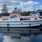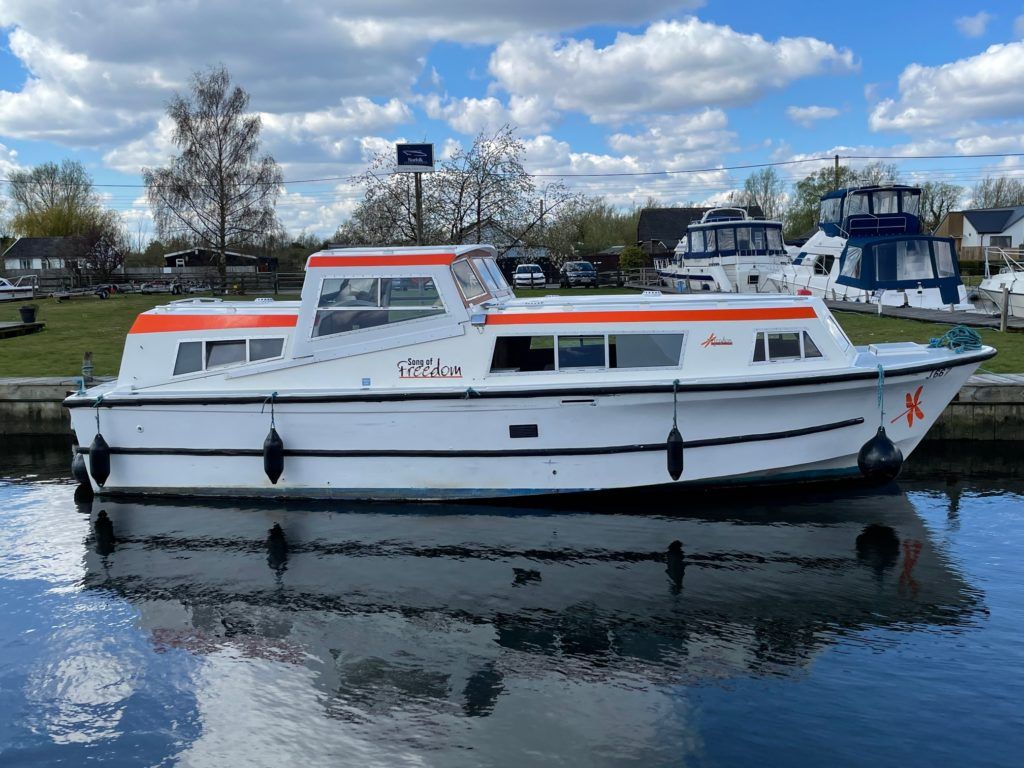 ASTON 30 – Circa 1975 – Powered by a single BMC diesel through a shaft – 6 berth accommodation with toilet and shower – Specifcation to include; warm air heating, holding tank, 1000w inverter, oven/grill, hob and refrigerator, 12v supply. Sliding centre cockpit roof with winch. A low air draft river cruiser with diesel economy. Perfect for extended cruising of the inland waterways!