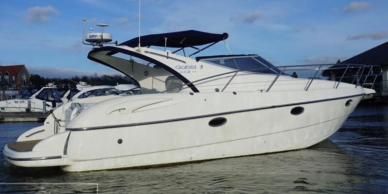 Atlantis Gobbi 345 – 2005 – 2 x Volvo Penta D4 260hp diesel engines. 6-berth accommodation with a toilet and shower compartment. Specification to include; Bow thruster, battery Charger, shore power, 2kw inverter, Garmin GPS/Radar, speed and depth log, VHF and AIS, electric windlass, extended bathing platform, electric engine hatch, hinged radar mounting, Webasto warm air heating, trim tabs. Extensive service work in 2022 including engine and stern drive service, anodes, long life antifoul and more. Cockpit seating and sun pads recovered with Silvertex. An stylish well maintained cruiser with the benefit of a low air draft for Broads cruising.