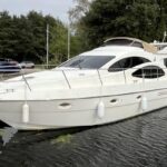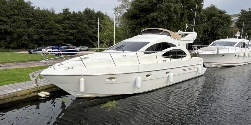 Azimut 42 – 2000 – 2 x Caterpillar 3126 DITA 385hp diesel engines through shafts. 4 berth accommodation over two en-suite cabins. Island double master cabin and twin berths in mid cabin. Specification including 8kw generator, shore power, battery charger, immersion heater, electric windlass, passerelle, leather upholstery, chart plotter, Autopilot, VHF and more. A single owner boat from new, well presented and with incredibly low engine hours at 183.