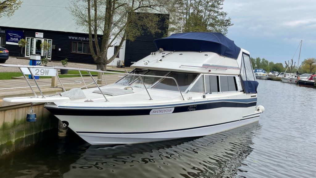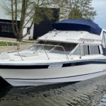 BAYLINER 2450 COMMAND BRIDGE – Single Izusu 4JB1TC 112hp diesel through a sterndrive – 2 berth accommodation with toilet and shower – Specification to include; Shore power supply with 240v sockets, holding tank, warm air heating, VHF. Engine, sterndrive service and antifoul all in 2022. Re-engined with more economical diesel set up – a very smart Bayliner 2450 now converted to explore the inland waterways!