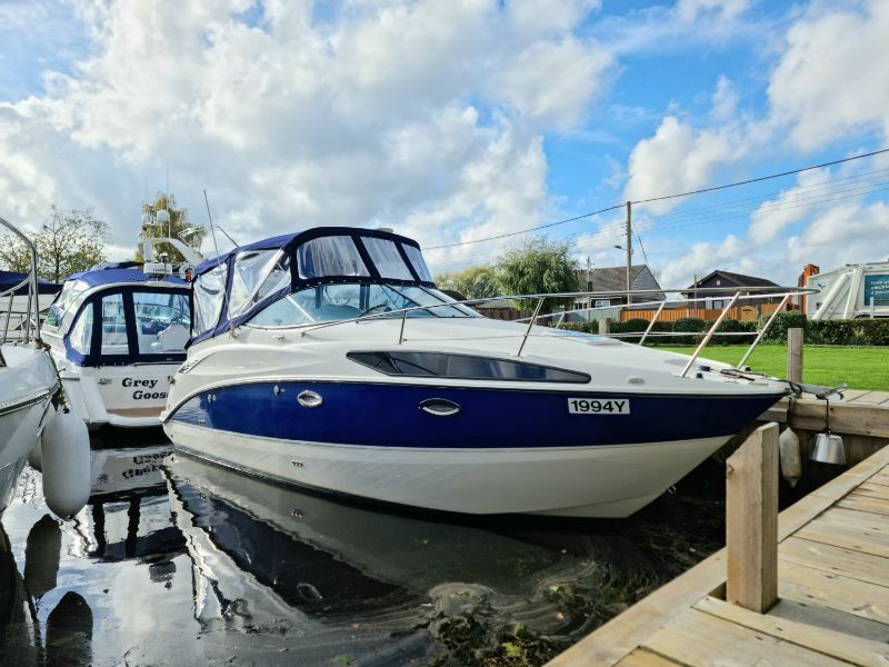 Bayliner 265 – 2006 – Single Mercruiser 5.0l MPI 220hp petrol through a sterndrive. 4 berth accommodation with 1 x toilet/shower compartment to holding tank. Specification to include; Shore power with 240v sockets, battery charger, immersion heater, and trim tabs. Brand new Bailey & Stone canopy. A well-presented stylish sports cruiser with great entertaining space and comfortable overnight accommodation.