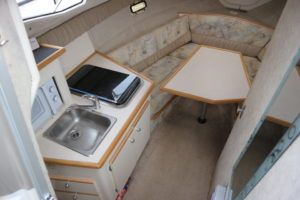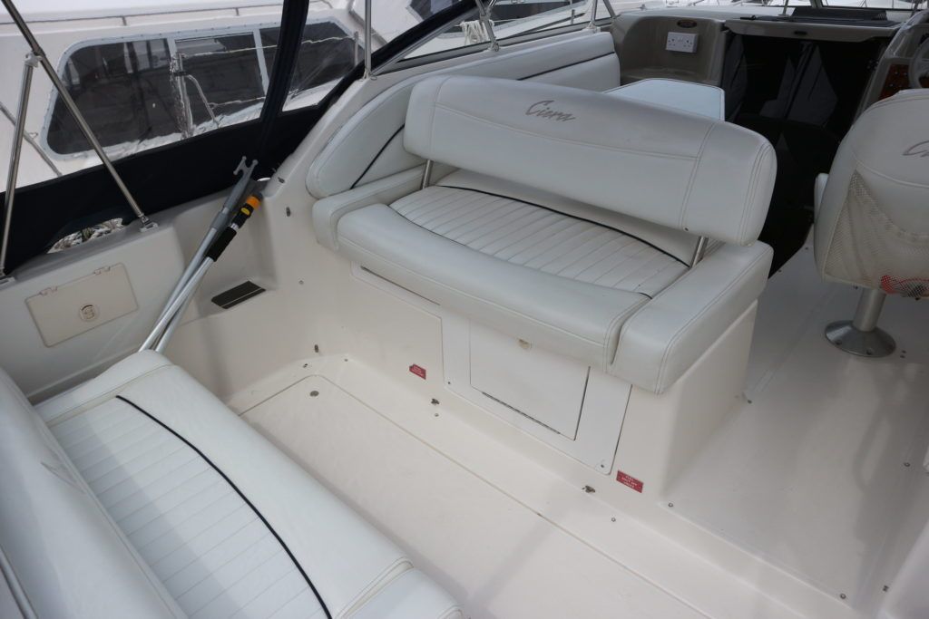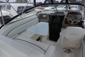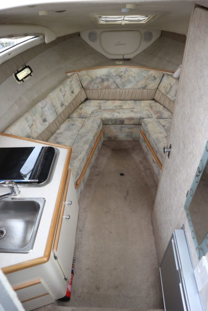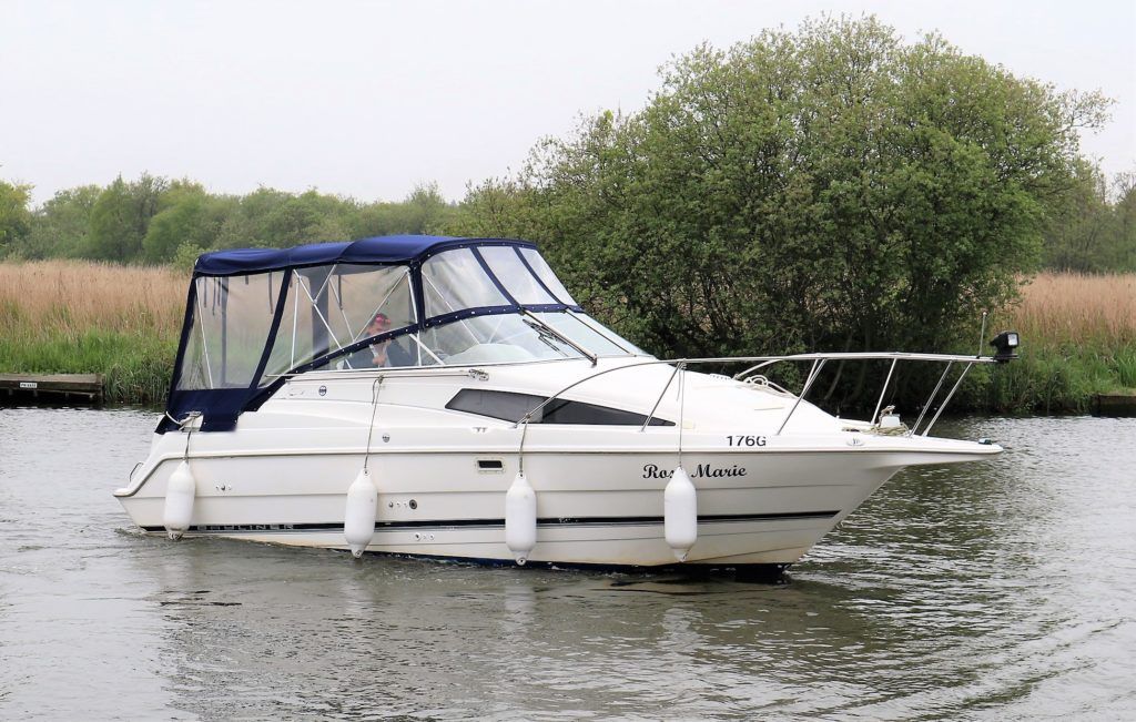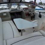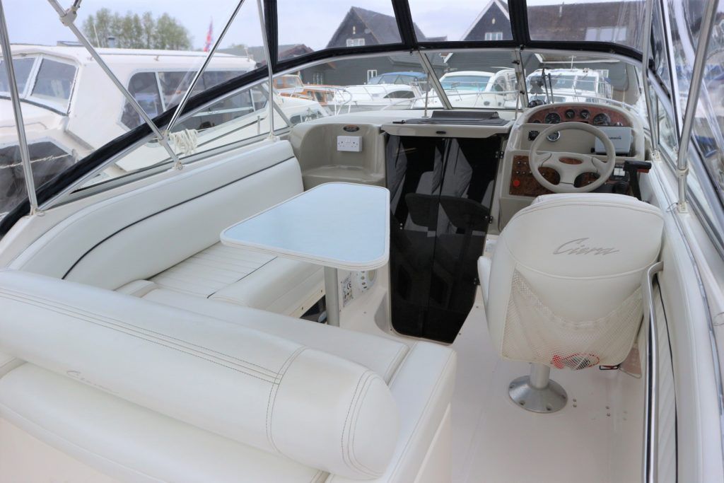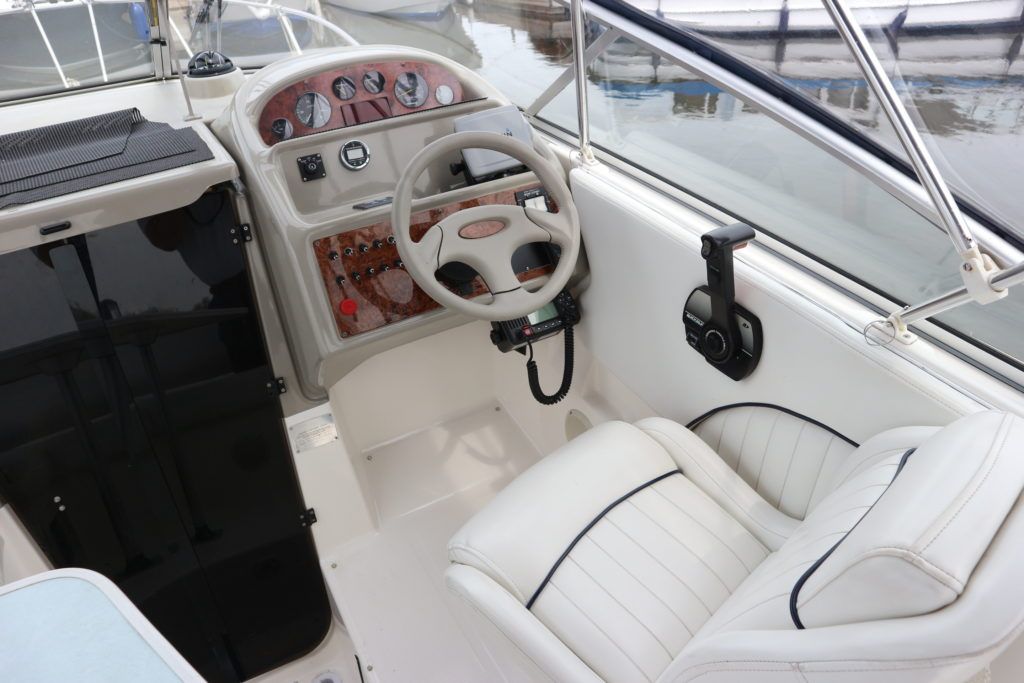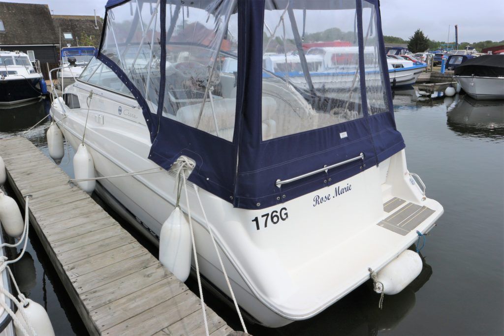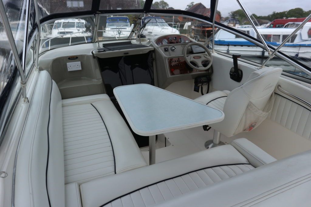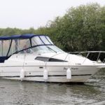 BAYLINER 2655 – 1997 – Powered by a single Yanmar 4LHA-STZP 240hp diesel engine. 4 berth accommodation with one toilet/shower compartment. Well specified to include bow thruster, warm air heating, holding tank, trim tabs, Garmin GPS, shore power supply, battery charger, immersion heater, VHF. A lovely example of these popular sports cruisers benefiting from a diesel engine and great specification. Ideal for coastal cruising or inland with its low air draft.