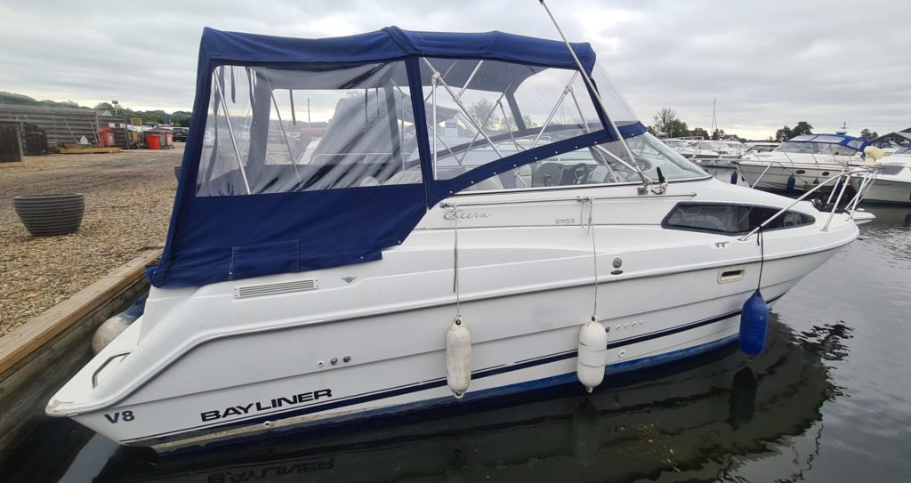 BAYLINER 2655 Cierra – 1999 – Powered by a single Mercruiser 5.0l V8 petrol through a sterndrive. 4 berth accommodation with toilet and shower. Specification to include new canopy Sept 2021, fridge, microwave, 2 burner alcohol/electric stove, warm air heating, shore power, garmin 240 fishfinder, anchor winch, teak and holly effect cabin flooring, Engine rebuild in August 2022, Boat safety certificate may 2023, Low air draft for increased inland access.