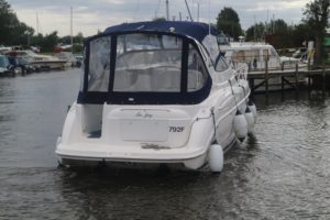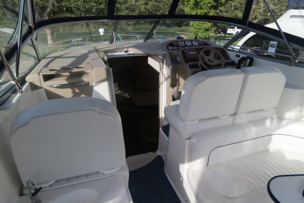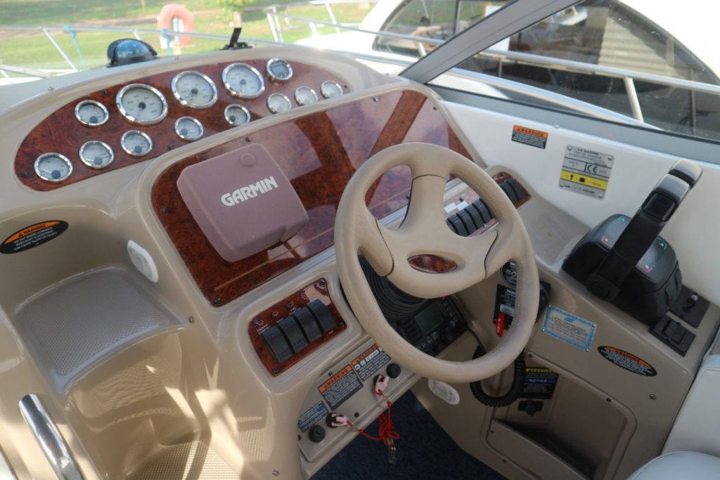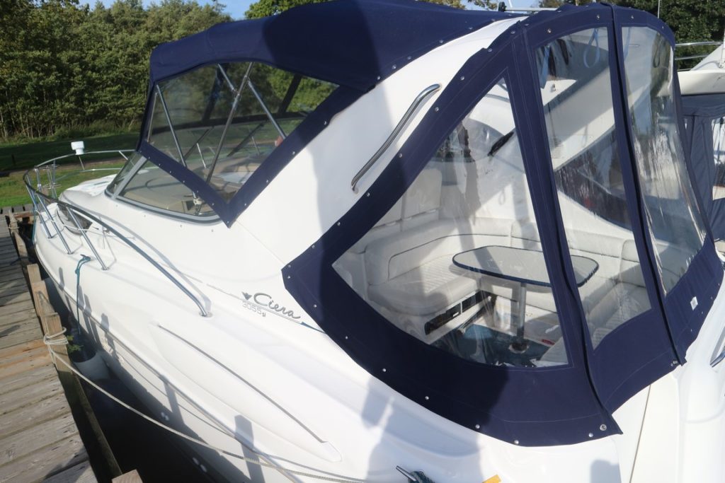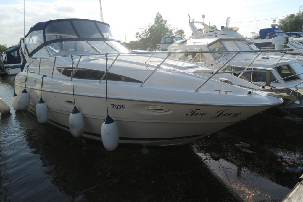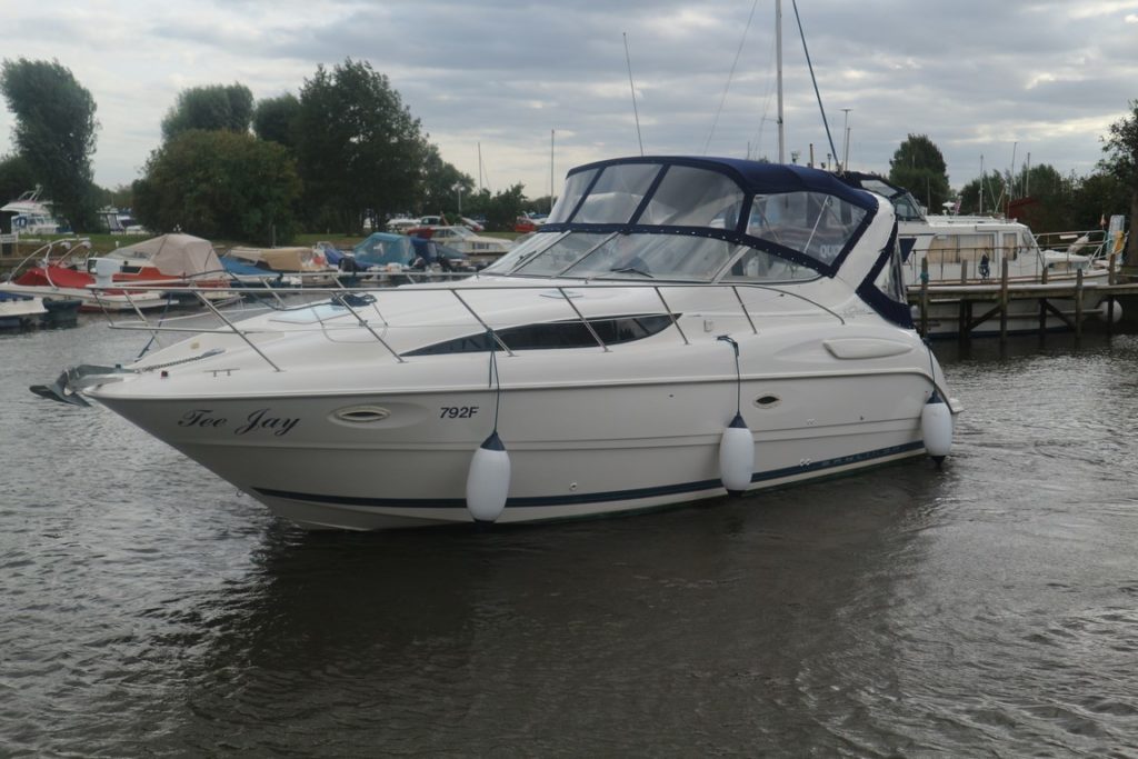 BAYLINER 3055 CIERA SUNBRIDGE – 2001 – Powered by twin Mercruiser 5.0l EFI 240hp petrols. 6 berth accommodation with one toilet and one shower. BSC 10/21. Specification to include; holding tank, trim tabs, electric windlass, Garmin GPS and shore power supply. An NYA stock boat benefitting from a recent drive service, full machine polish, antifoul and new canopy. Engines to be serviced at point of sale. An excellent example, in great condition throughout.