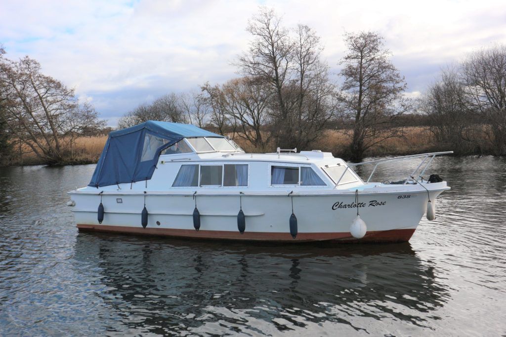 BOUNTY 27 MK1 – 1980 – Powered by an BMC 1.5 36hp diesel engine. 4 berth accommodation with 1 x electric toilet/shower compartment. Galley with 2 burner gas hob, oven grill, sink and 12v fridge. Specification including shore power, battery charger, warm air heating, solar panel, folding screens and canopy. BSC 05/21. A tidy example of these popular river cruisers benefitting from recent upgrades along with a desirable low air draft and shaft driven for economical river cruising.
