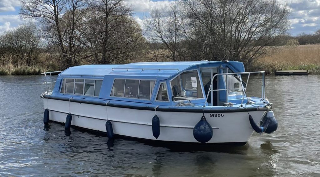 BOUNTY 28 – 1980 – Powered by a BMC 1.5 (36hp) diesel engine through hydraulic drive. 4 berth accommodation with 1 x toilet/shower compartment. Large galley with sink, fridge and microwave. Specification including shore power, battery charger, 2400w inverter, Eberspacher warm air heating, electric windlass, forward and aft well covers, fully sliding roof over saloon, original gel coat, BSC 07/23. A well presented & maintained example of this ever popular river cruiser offering comfortable accommodation and a low air draft for exploring the inland waterways.