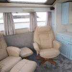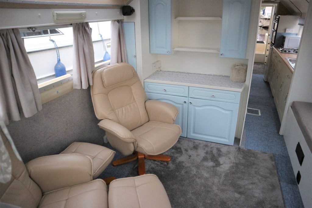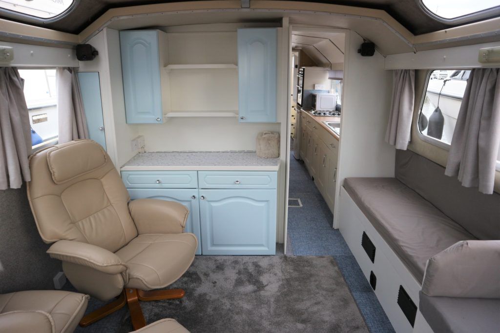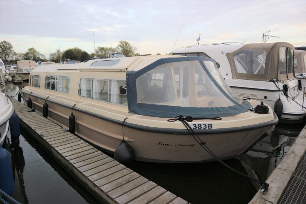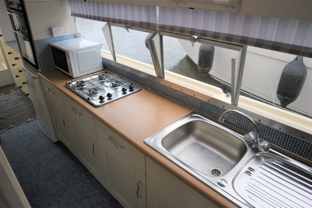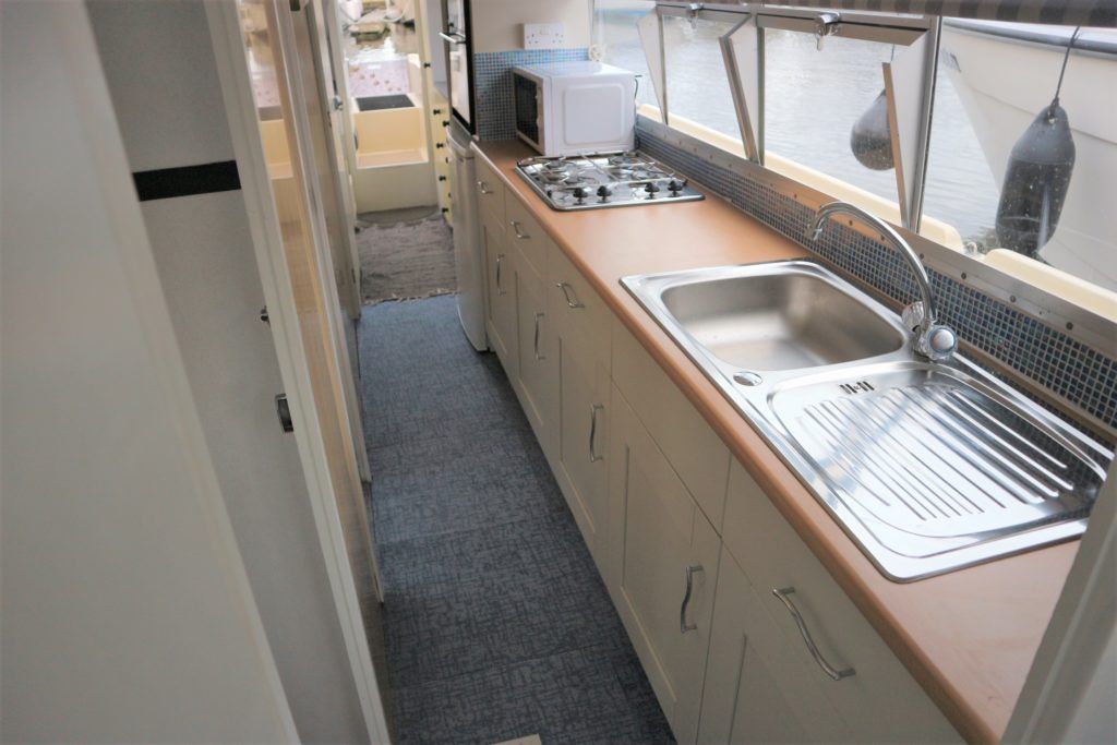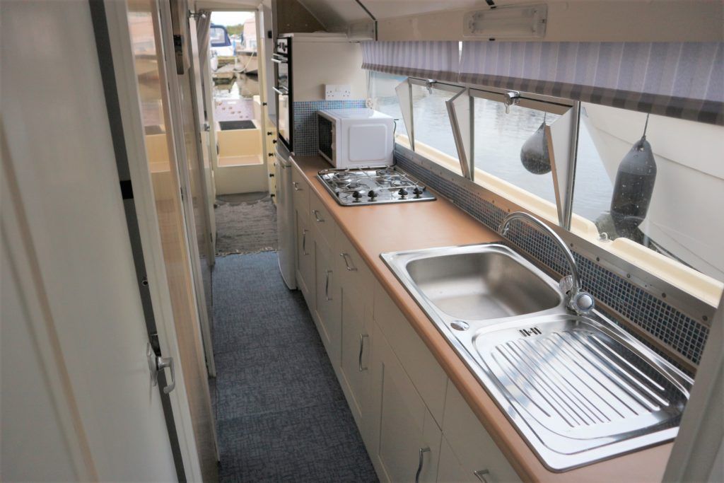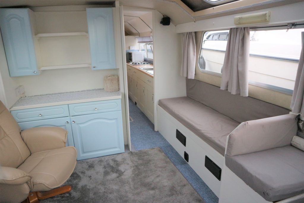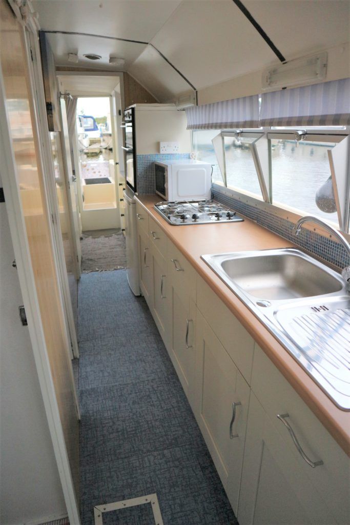 BOUNTY 37 – Circa 1974 – Powered by a BMC 1.5 diesel engine. 5 berth accommodation with 1 x toilet/shower compartment. Large galley with four burner hob, oven, grill, microwave & fridge. Specification including shore power, inverter, battery charger, warm air heating, full professional re-paint in 2016, engine serviced 03/19, BSC 03/23, free standing chairs in saloon. A spacious family cruiser with comfortable accommodation benefiting from a recent repaint and presented in good condition.