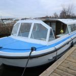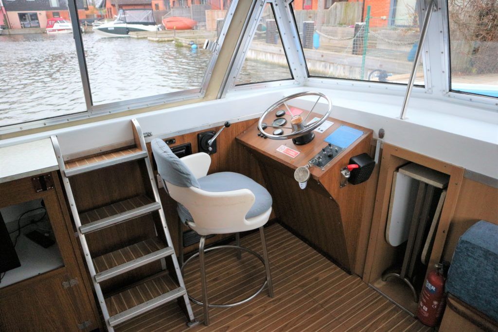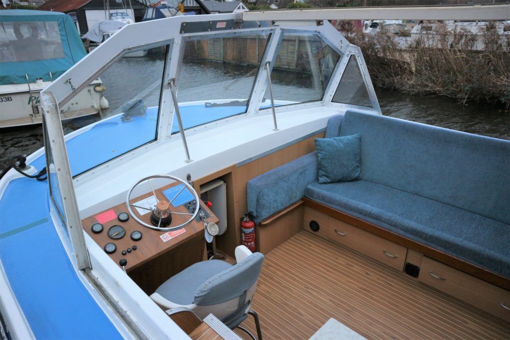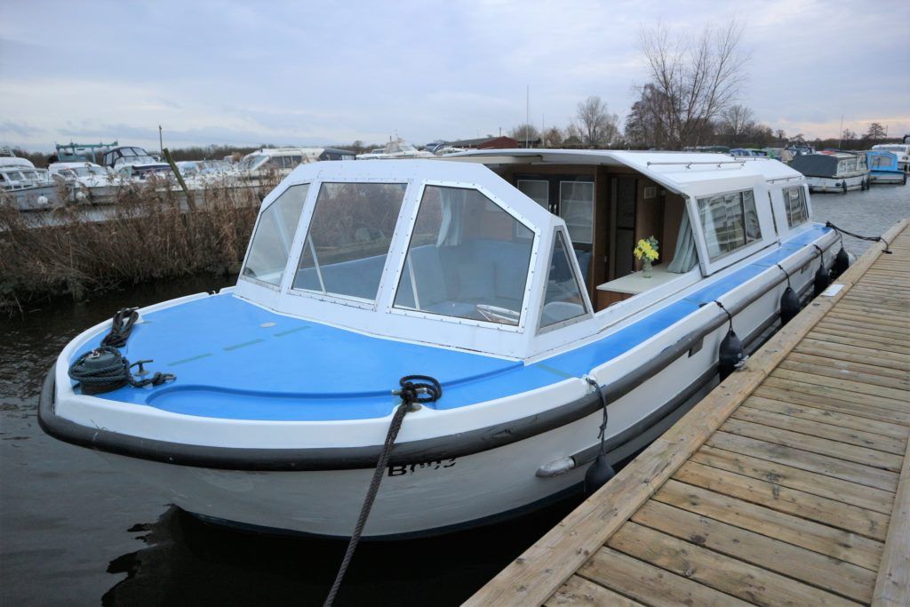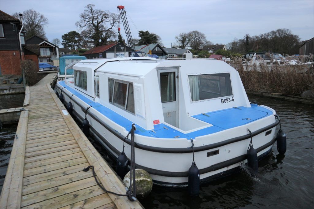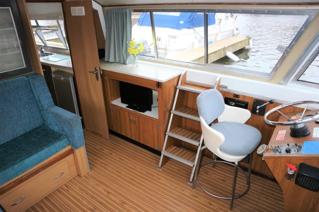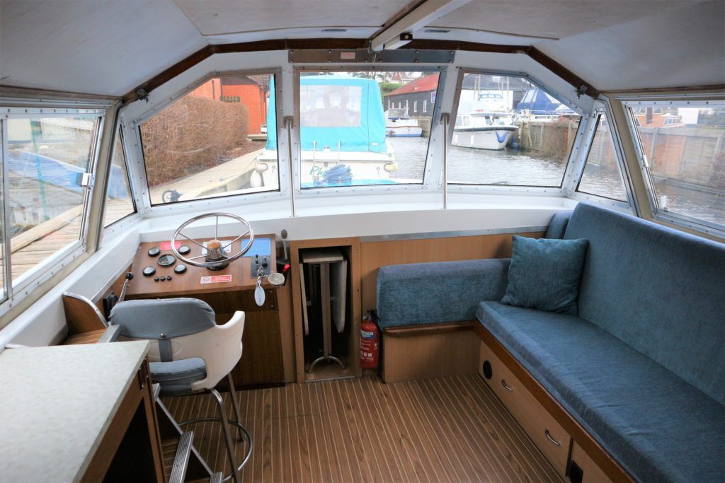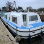 BOUNTY 37 MKII – Circa 1980 – Powered by a BMC 1.5 (36hp) diesel engine. Six berth accommodation over two cabins and saloon with 1 x toilet/shower compartment. Specification including warm air heating, teak and holly effect flooring throughout, full sliding canopy over saloon. BSC 06/23. A spacious and comfortable single level river cruiser with a low air draft, ideal for extended river cruising or potential live aboard.
