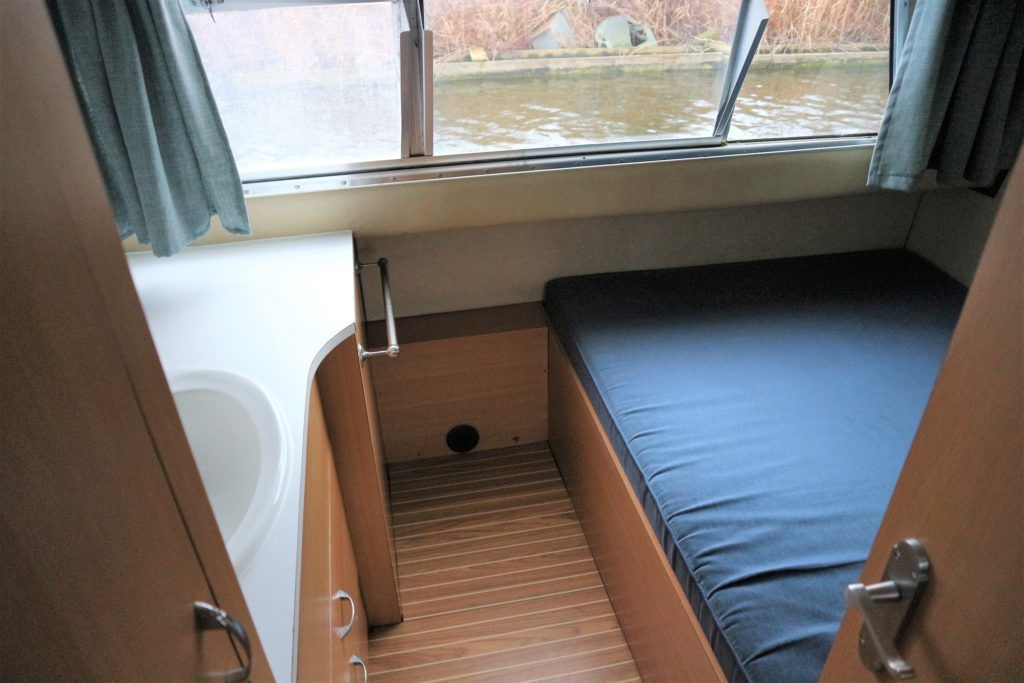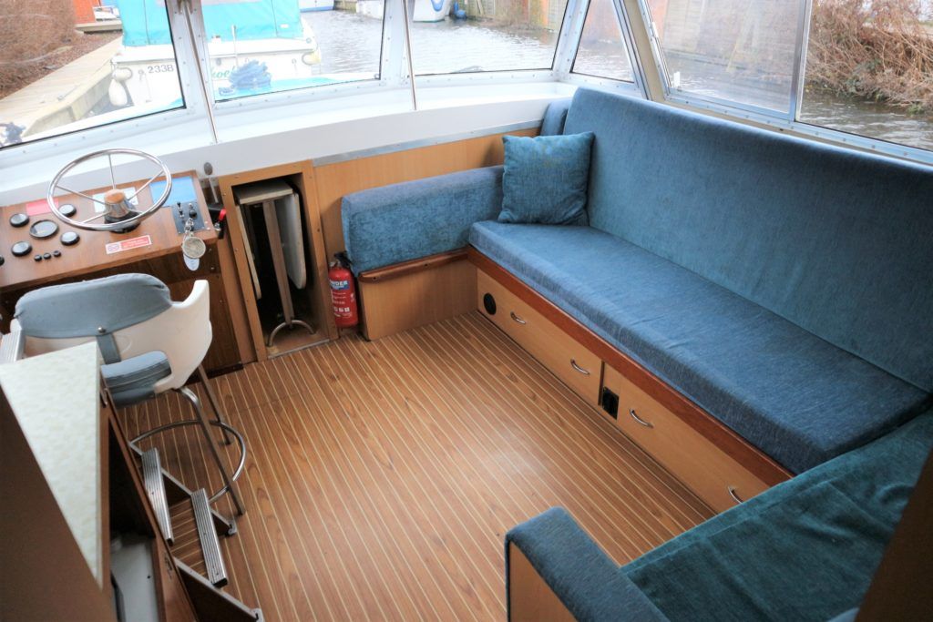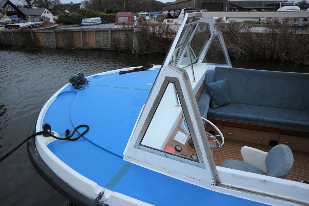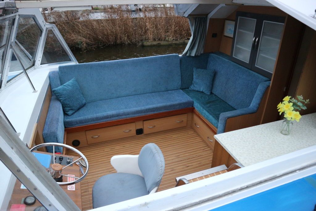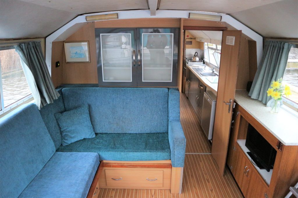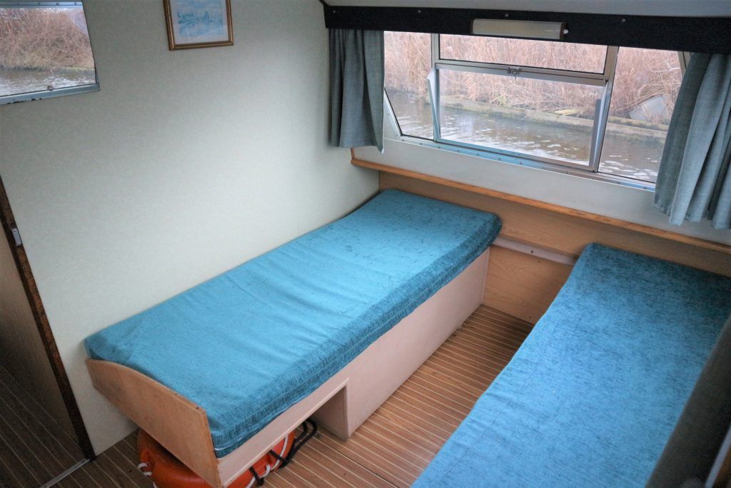 BOUNTY 37 MKII – Circa 1980 – Powered by a BMC 1.5 (36hp) diesel engine. Six berth accommodation over two cabins and saloon with 1 x toilet/shower compartment. Specification including warm air heating, teak and holly effect flooring throughout, full sliding canopy over saloon. BSC 06/23. A spacious and comfortable single level river cruiser with a low air draft, ideal for extended river cruising or potential live aboard.