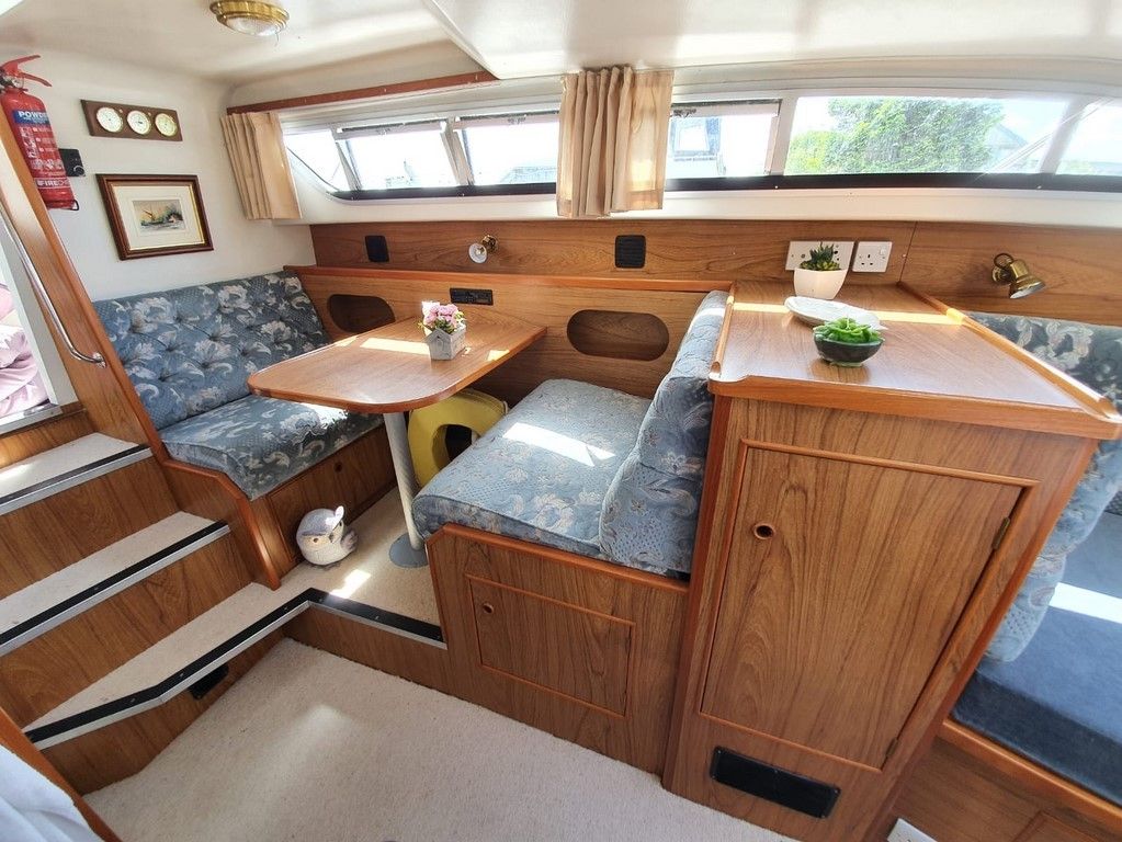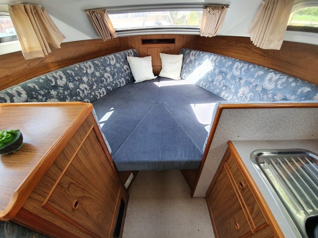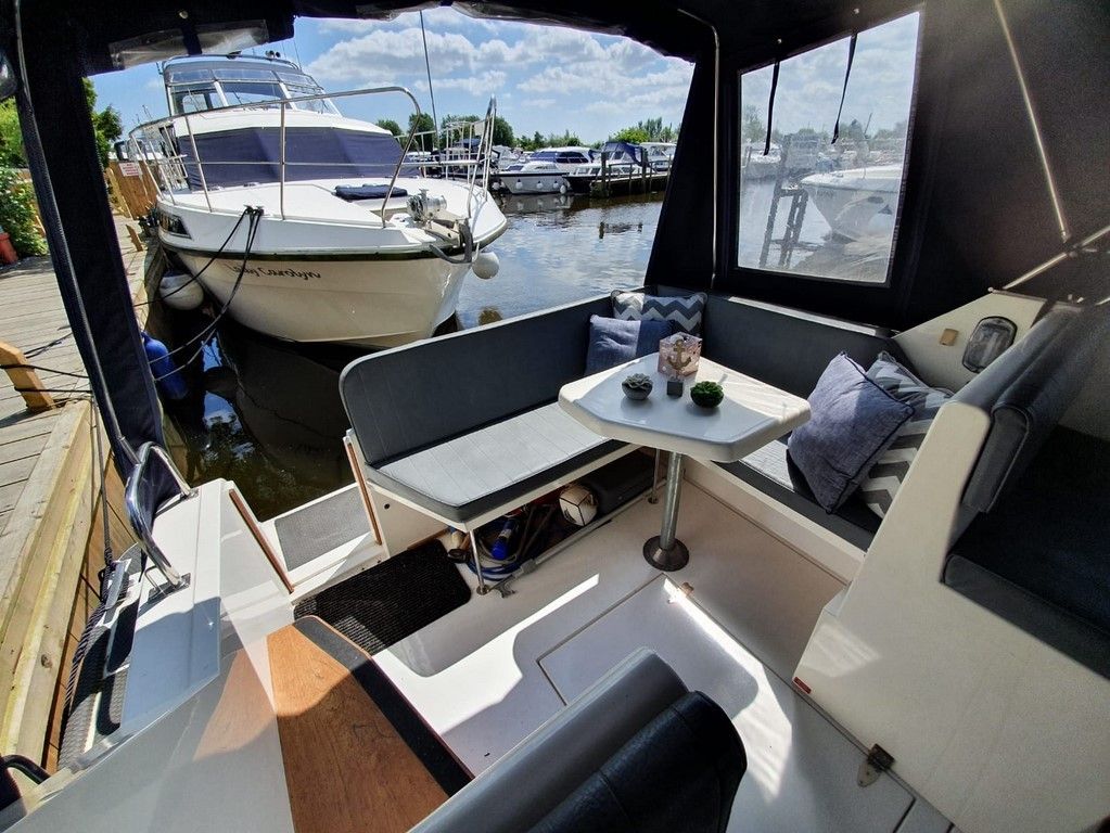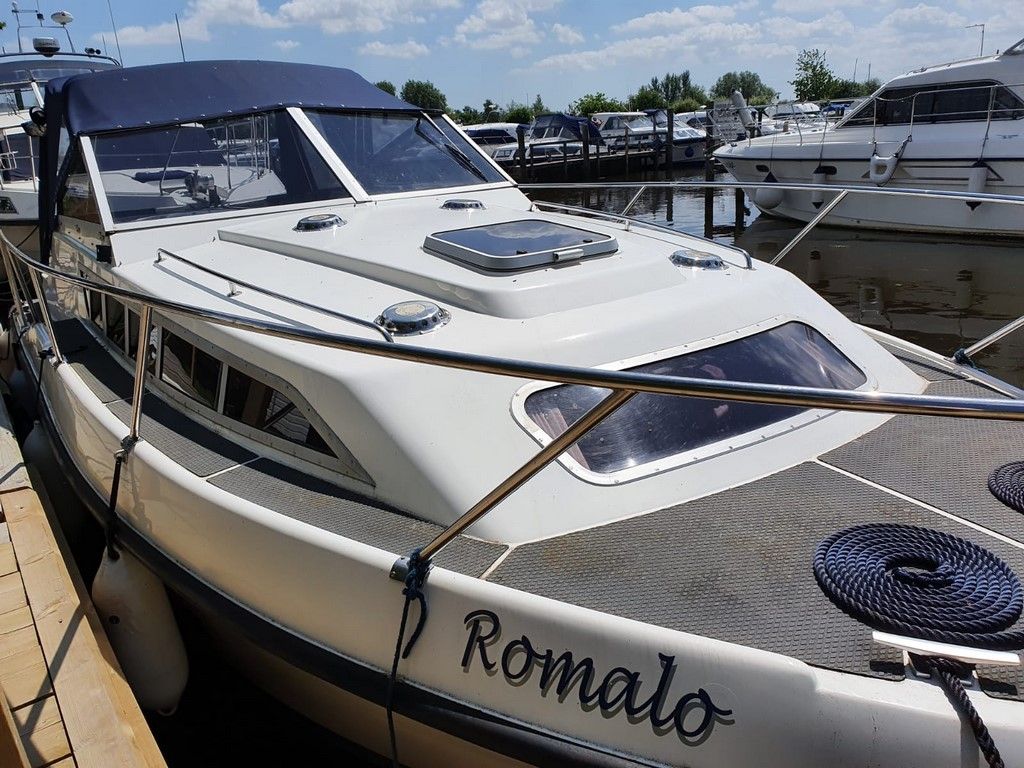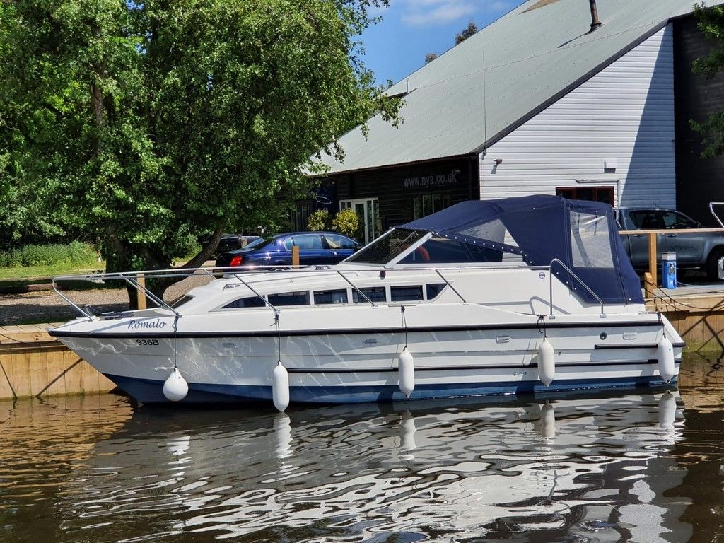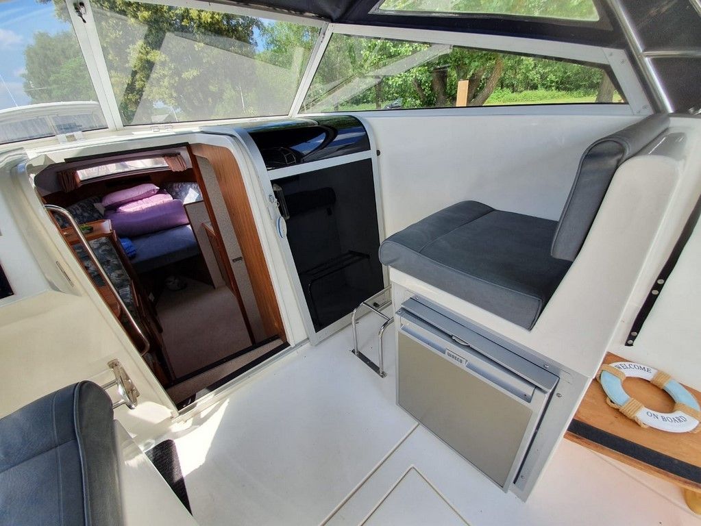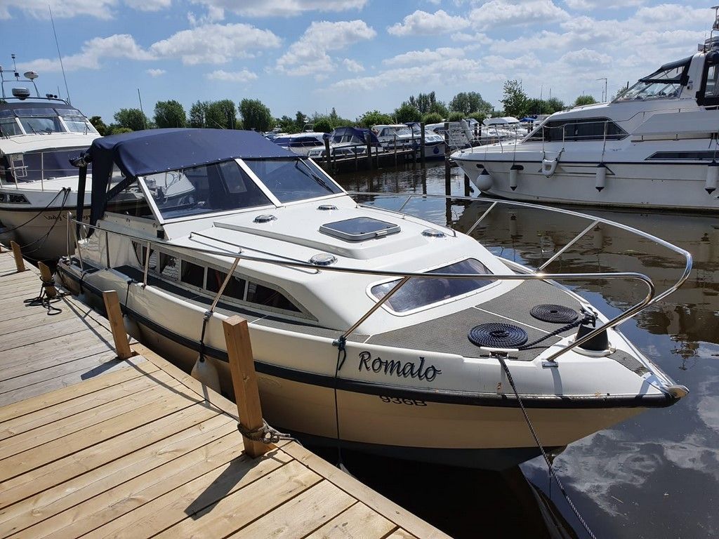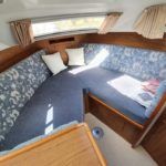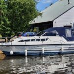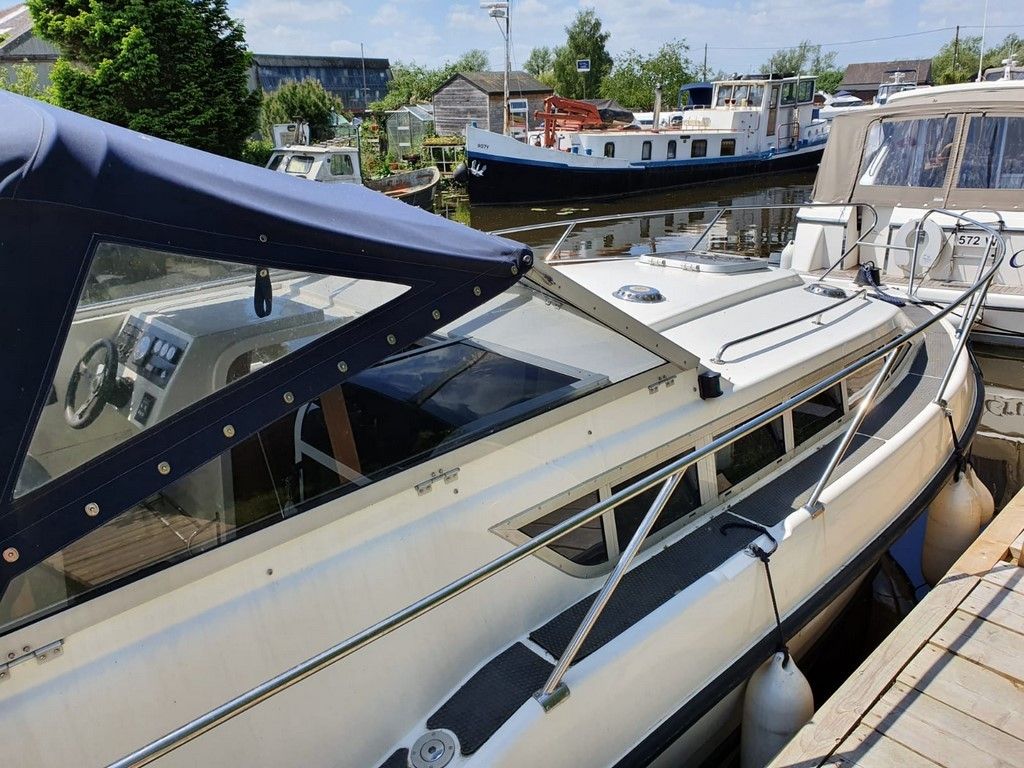 BOUNTY BRISTER 27 – 1995 – Powered by a single Kubota 35hp diesel through a shaft. 2 berth accommodation with toilet and shower. Specification to include; Sidepower bowthruster, warm air heating, holding tank, shore power supply with battery charger and 240v sockets. Folding canopy framework and screens giving a much reduced air draft for great access across the inland waterways. Full guard rails with non-slip decks. Sought after single diesel and shaft configuration, absolutely ideal for those wanting a well specified river boat to explore as much of the Norfolk Broads as possible.