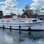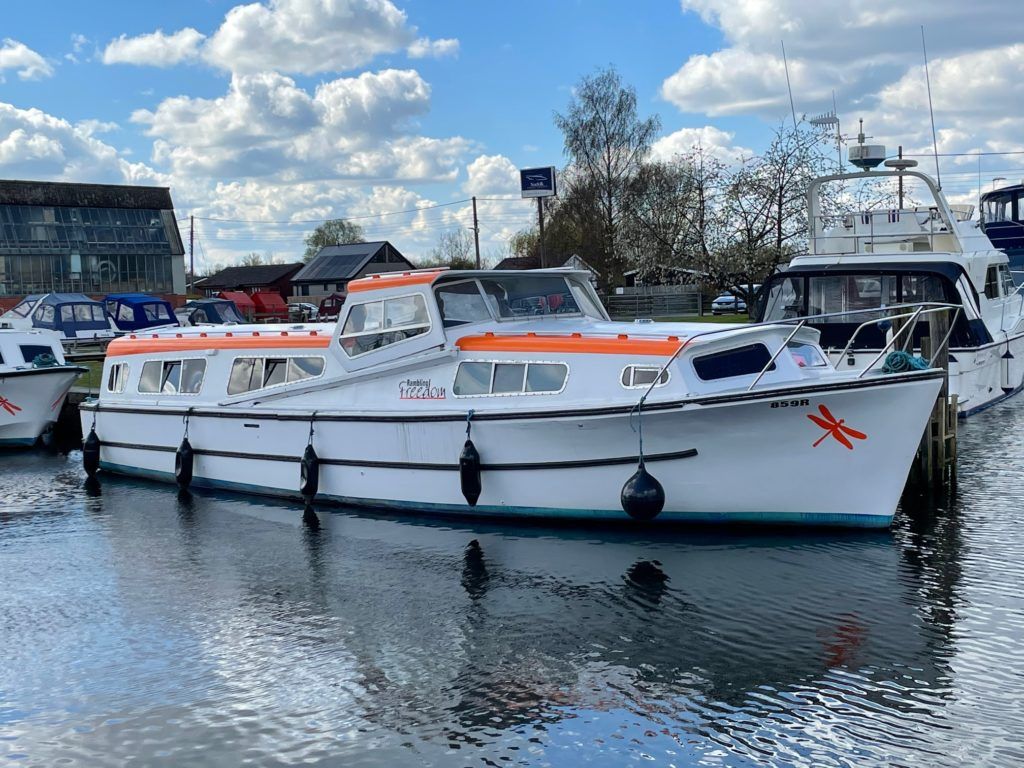 BOURNE 40 – Circa. 1970’s – Powered by a single diesel engine through a shaft – 8 berth accommodation with 2 toilets and shower. low air draft cruiser with sliding centre cockpit roof. Specification to include; holding tank, warm air heating, Waeco IP1002 inverter, 4 burner hob, oven, grill and refrigerator, shore power supply with 240v sockets.