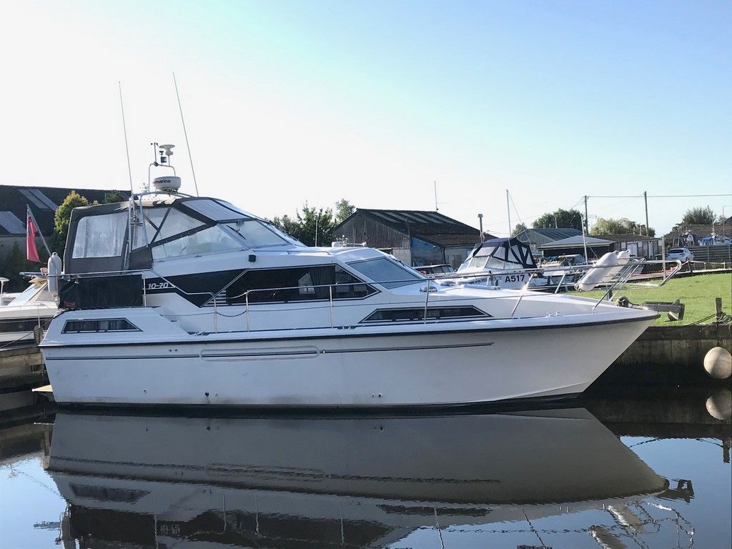 BROOM 10/70 – 1989 – Powered by twin Volvo TMD41A 150hp diesels on shafts – 6 berth accommodation with two toilets and showers. Specification to include; Fisher Panda generator, 600w inverter, Webasto warm air heating, shore power with 240v sockets, immersion and charger, holding tank,, updated Raymarine navigation equipment to include touchscreen plotters and VHF and more! Folding radar arch and windscreens for improved inland access. A well specified example of these ever popular Broom cruisers , offered in very good order throughout!