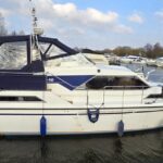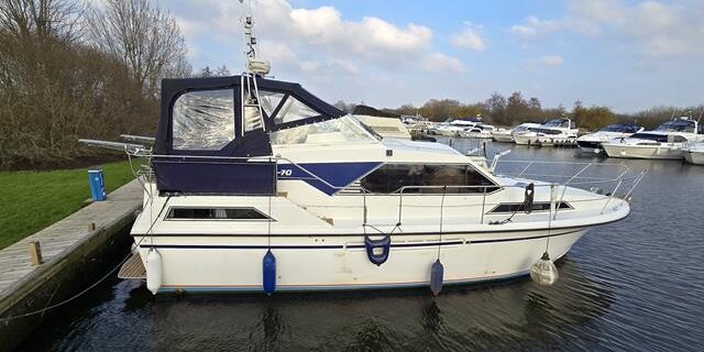 Broom 10/70 – 1988 – 2 x Volvo TMD41A 150hp diesel engines. 6 berth accommodation with two toilets and showers. BSC 03/26. Specification to include; Bowthruster, inverter, holding tank, warm air heating, shore power supply with battery charger, trim tabs, radar, chart plotter, windlass, aft deck synthetic teak and more. Folding arch for improved inland access. A versatile semi-displacement cruiser, with inland and offshore capabilities.