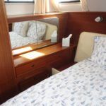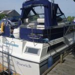 BROOM 1070 – 1988 – Twin Volvo TMD41A 150HP Diesel Engines. 6 berths with 2 toilets (1 to holding tank and 1 electric toilet sea) and 2 showers. Trim tabs, Shore power, 1800w Inverter, Hydraulic steering, Battery charger, Webasto warm air heating system, Bowthruster. Well maintained by her current owner to include, recent engines service, antifoul, new anodes and polish. A spacious and comfortable cruiser, ideal for family boating.