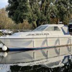 BROOM OCEAN 29 HARDTOP – 1995 – Powered by a single Nanni N4.50 (50hp) diesel through a shaft – 4 berth accommodation with toilet and shower – Specification to include; holding tank, bowthruster, shore power supply with battery charger, immersion and 240v sockets, warm air heating, Raymarine bidata, VHF, hob, oven and grill. Serviced, Antifouled, compound & polished June 2021. Synthetic teak laid bathing platform and sliding wheelhouse sunroof. A fantastic example of these popular Broom river cruisers. Single diesel economy and good specification!