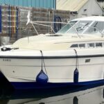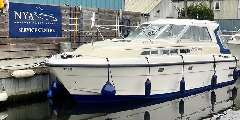 Broom 29 – 1995 – Powered by a Nanni 4.220HE 50hp diesel engine. 4 berth accommodation with 1 x Electric toilet to holding tank & shower. Galley with 2 burner gas hob, oven, grill and electric fridge. Specification including new bow thruster, shore power, battery charger, inverter, warm air heating, immersion heater, synthetic teak decking to cockpit. BSC 08/25. A popular sedan style river cruiser with comfortable accommodation. NYA Stock – Sold with 3 month engine & gearbox warranty.