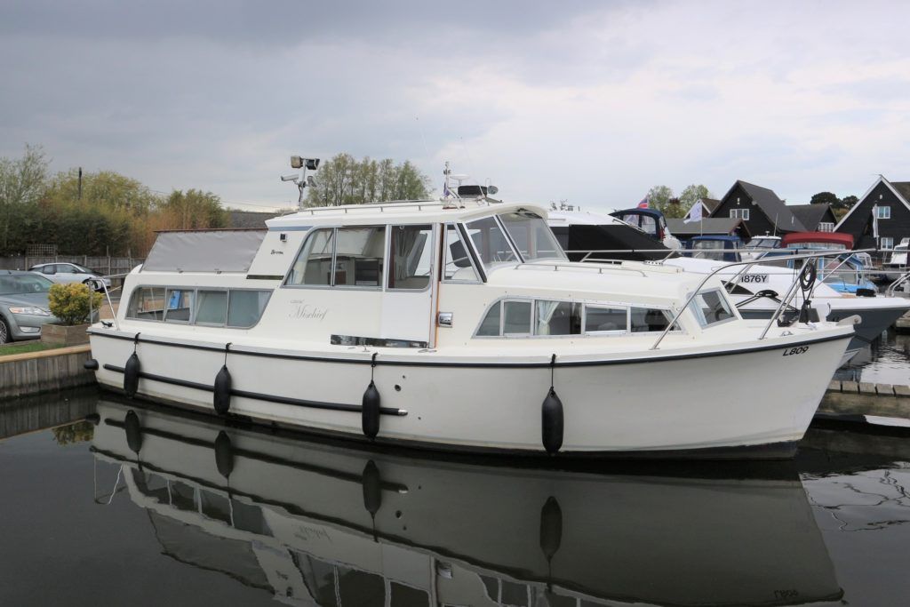 BROOM 30 – 1971, with twin Perkins 4.107 diesels (shaft drive). 6 berths inc saloon, electric toilets, shower, galley. Full interior refuibishement, windows resealed, starboard engine rebuild, battery charger, shore power, inverter, heating. A stunning example of these ever popular Broom cruisers, recently sympathetically re-furbished to a very high standard (See Service History section for extensive listing of recent works). Viewing highly recommended!