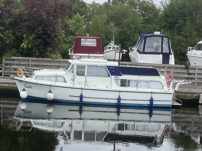 BROOM 30 – 1978 – Powered by twin Perkins 4108 48hp diesel engines. 6 berth accommodation with two toilets and a shower. BSC 08/25. Specification includes; a holding tank, gas immersion, shore power supply with 240v sockets and battery charger, new upholstery to cabins, full galley facility with a new cooker. Antifouled 2022. Current 2023/24 toll. A well-presented Broom 30 offering excellent accommodation for its size, ideal for extended inland boating or for use as a liveaboard.