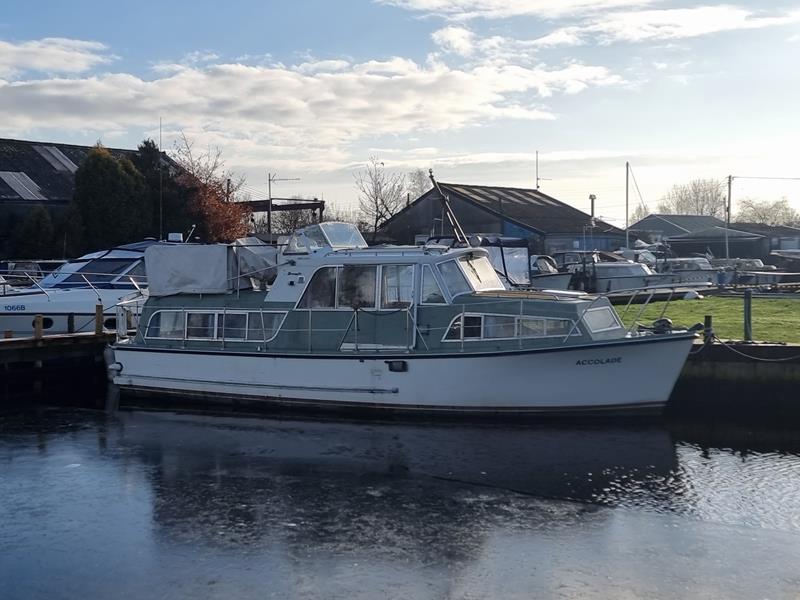 Broom 30 – 1972 – 2 x Perkins 4108 35hp diesels through shafts – 5 berth accommodation with 2 toilets and a shower – Specification to include; shore power supply with 240v sockets, battery charger, water heater, VHF, navigation lights, speedo, rudder indicators, hob, grill and refrigerator. BSSC 07/2025. Owned and loved by the same family since 1979! This is a rare opportunity to acquire a classic Broom 30 Mk III – a versatile family cruiser with the added benefit of an upper-deck seating arrangement.