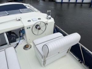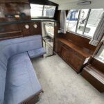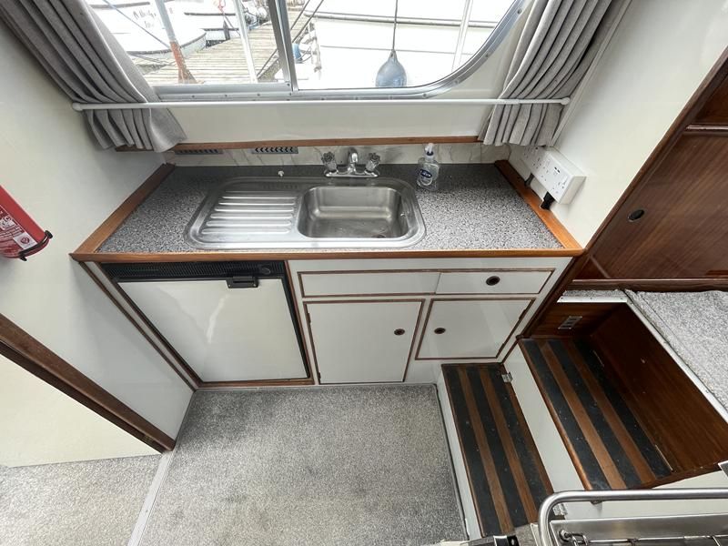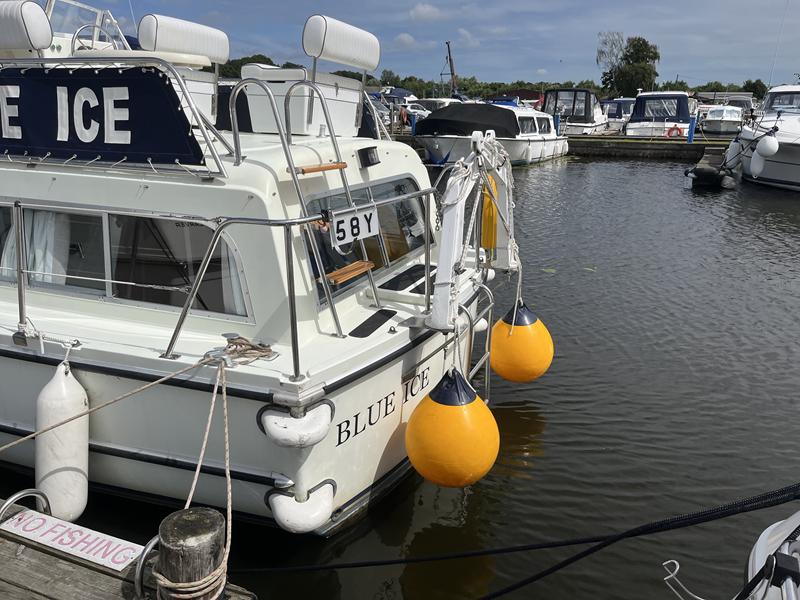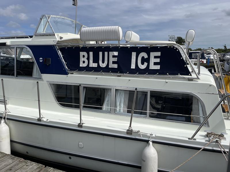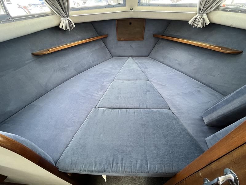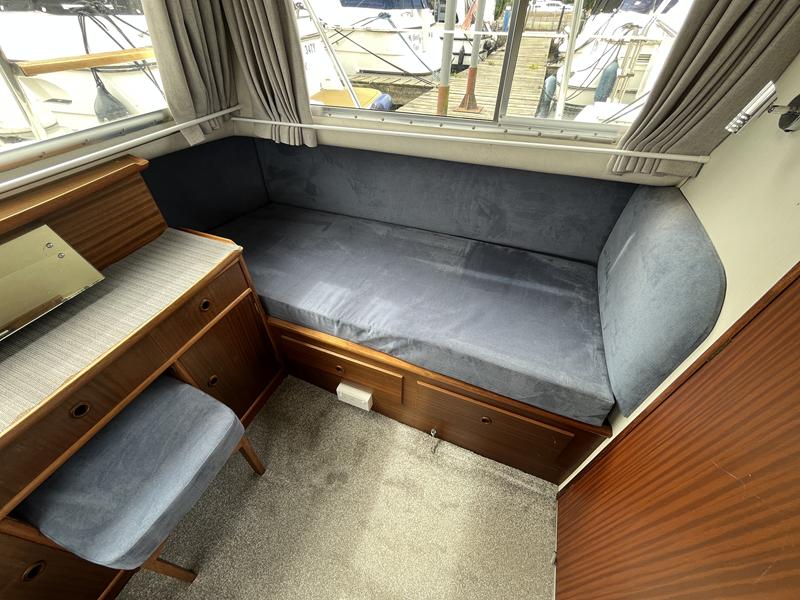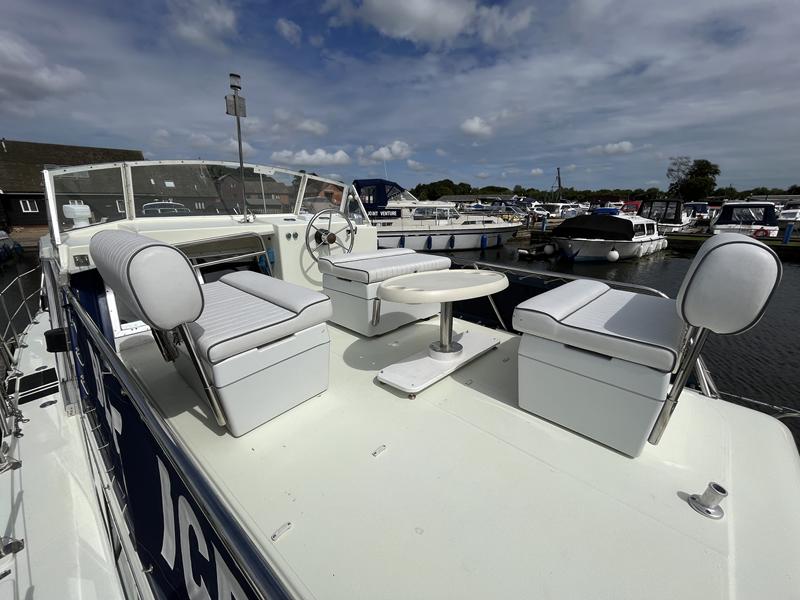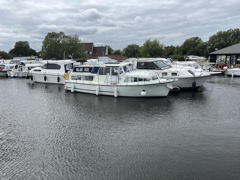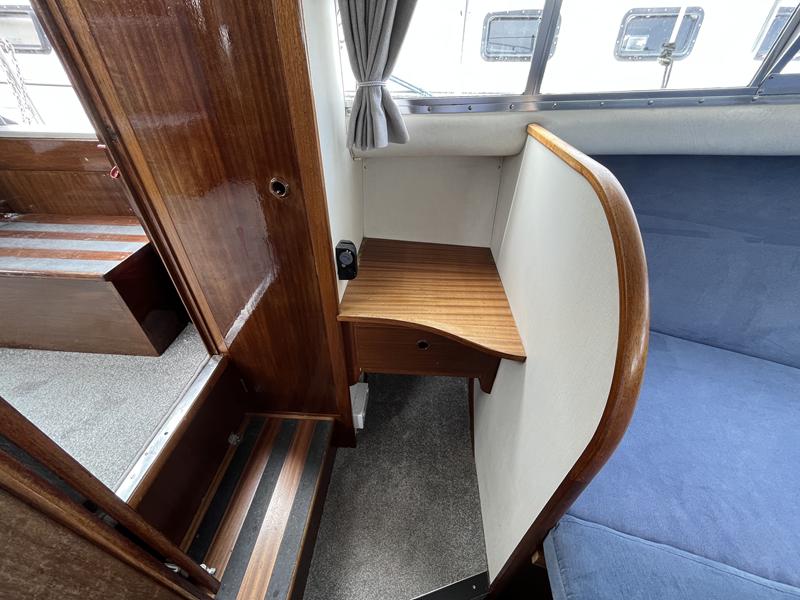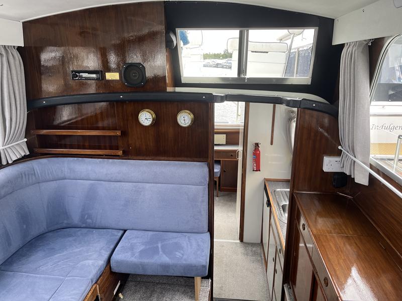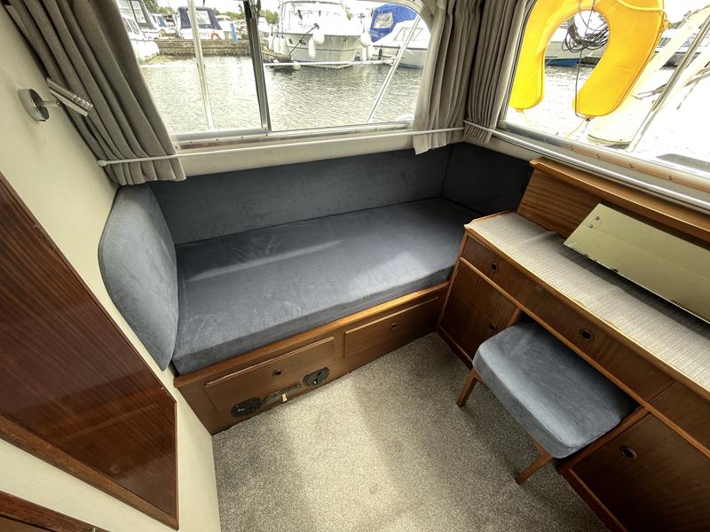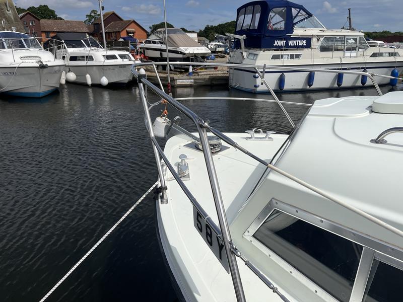 Broom 30 Dual Helm – 1981 – 2x Perkins 4108 diesel engines on shafts. Twin helm model with 6 berth accommodation, 2 toilets and a shower. Specification to include; Webasto warm air heating, shore power, battery charger, Neptune 2 burner hob and oven and grill, 12v fridge, folding windscreen, search light, electric anchor winch, Webasto sunroof, folding davits. Many recent updates. BSC until July 2028. ‘Blue Ice’ is a very tidy, well cared for and much updated example of these popular river/estuary/coastal cruisers.