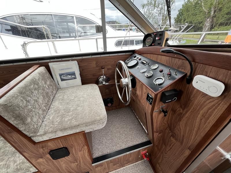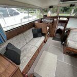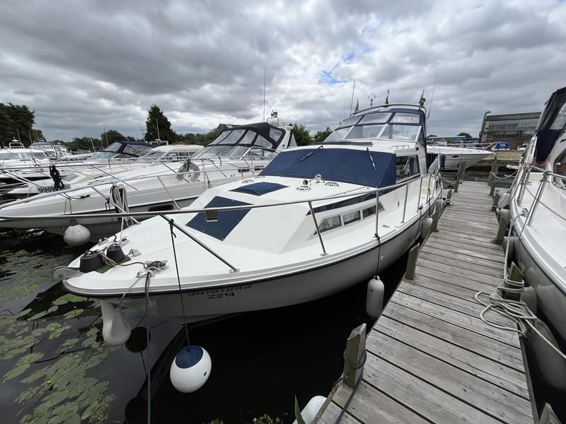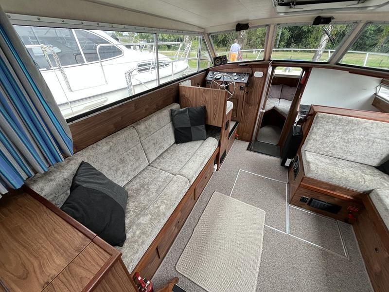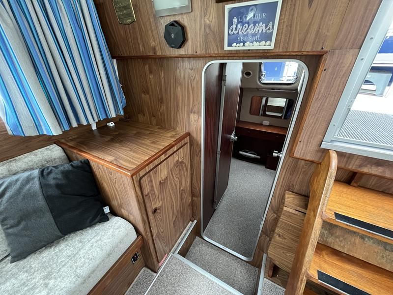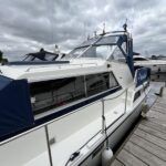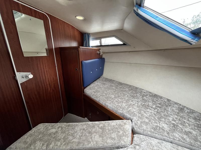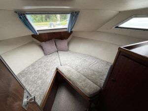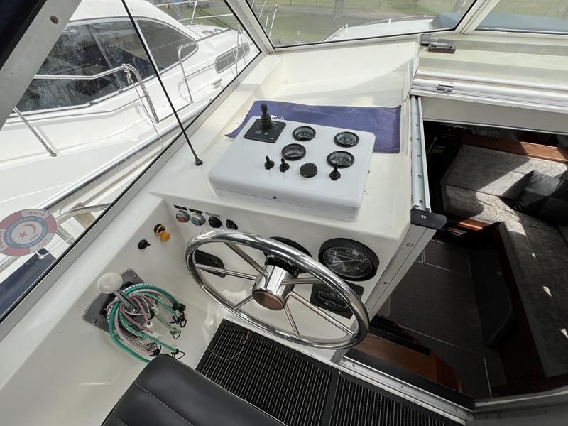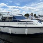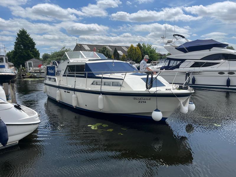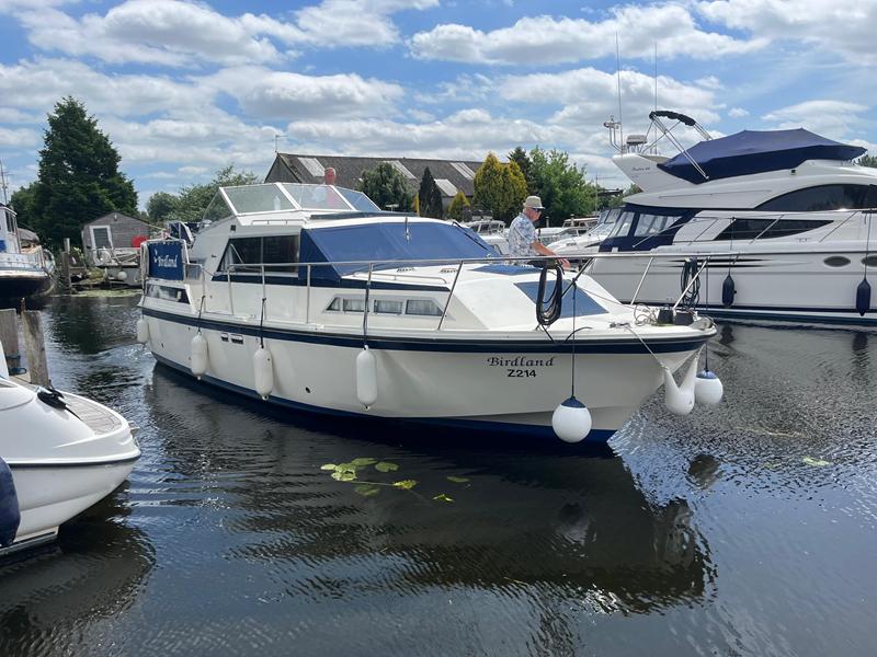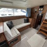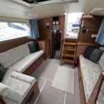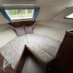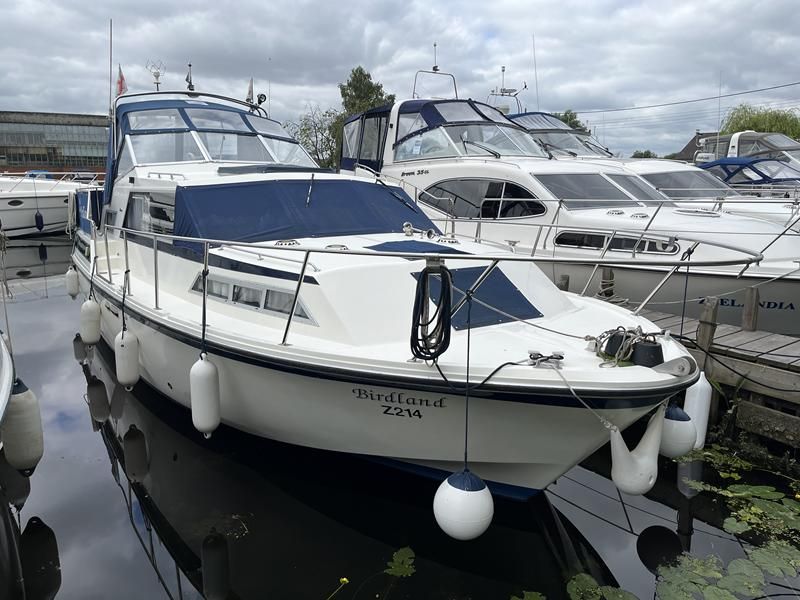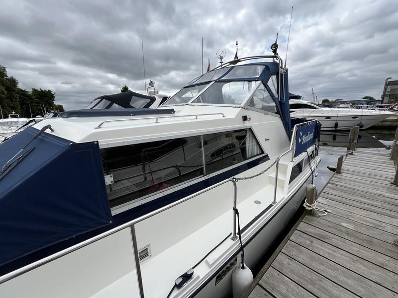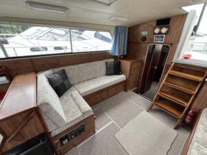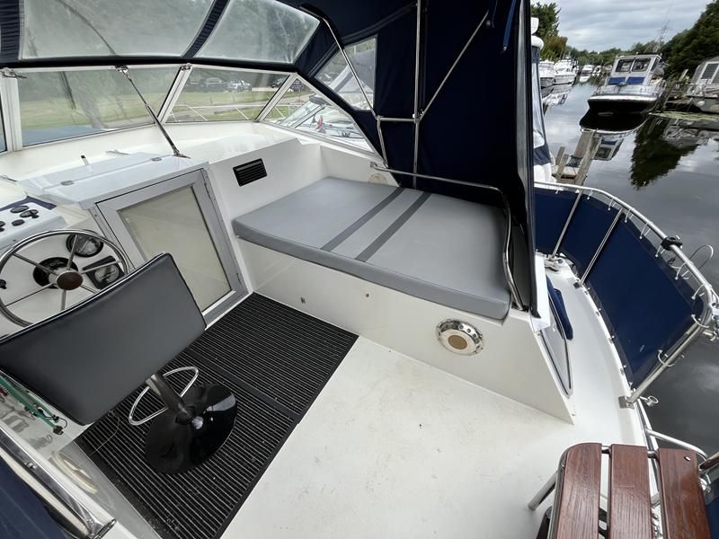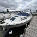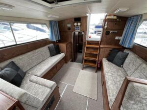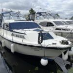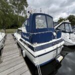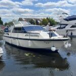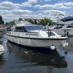 Broom 32 – 1983 (Commissioned 1984) – Powered by a 1.8ltr BMC Mermaid diesel engine through shaft. Up to 7 berth accommodation with two toilets and showers, including an aft cabin with en-suite facilities. Specification to include; Bow thruster, warm air heating, holding tank, hydraulic steering, shore power, battery charger, Waeco inverter, immersion heater/calorifier and more. Folding screens and radar arch for increased inland access. BSC 2027. A beautifully kept Broom 32, presented in its original gel coat, offering the perfect platform for family cruising.