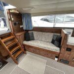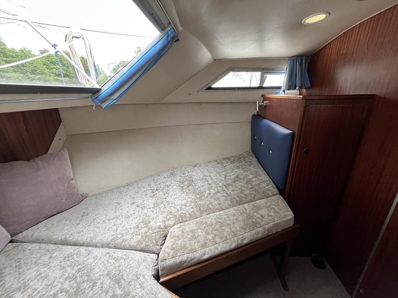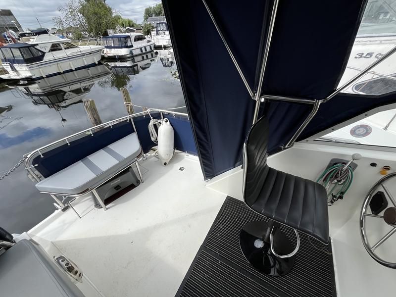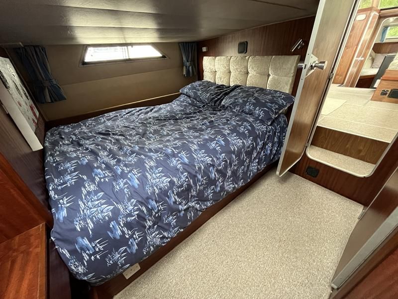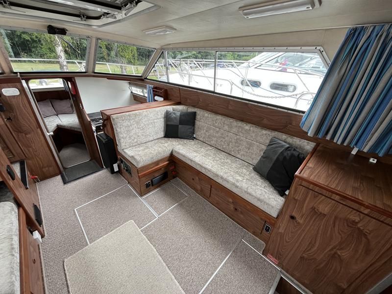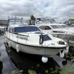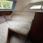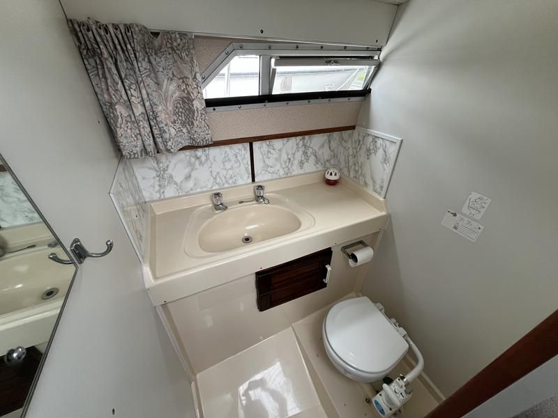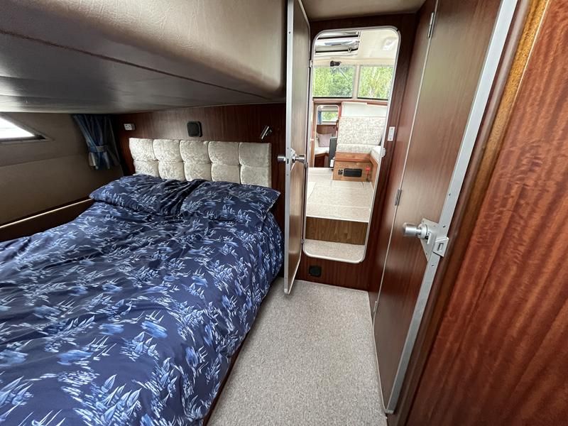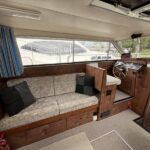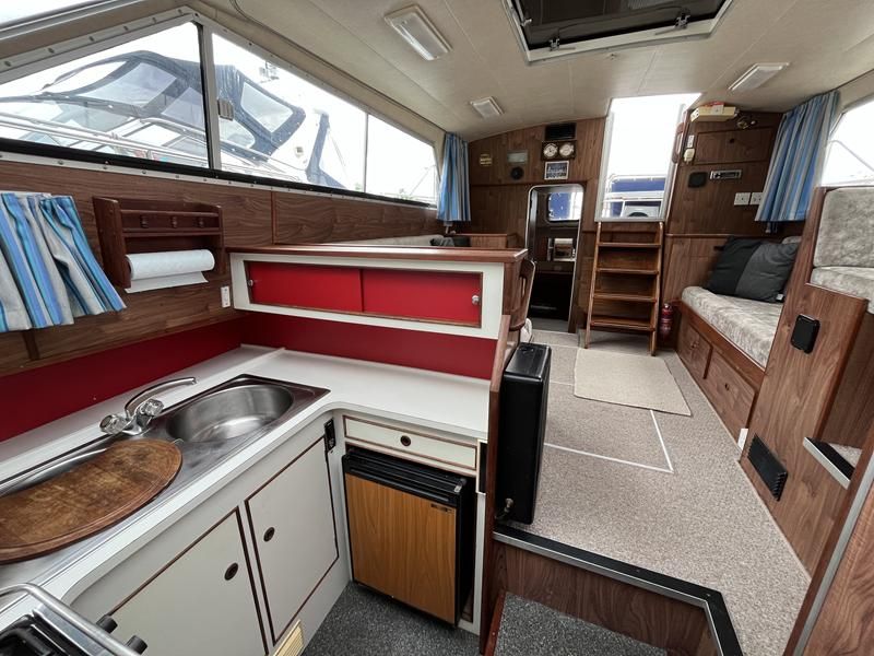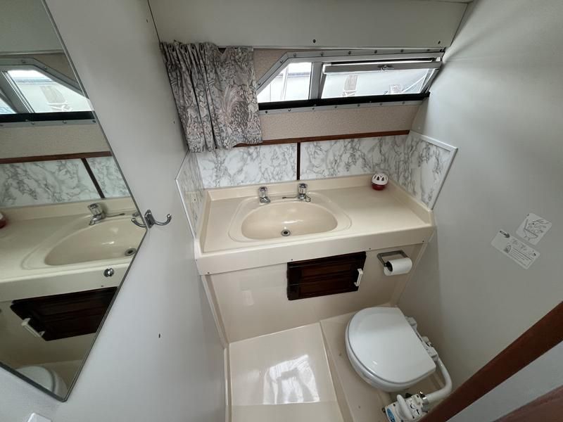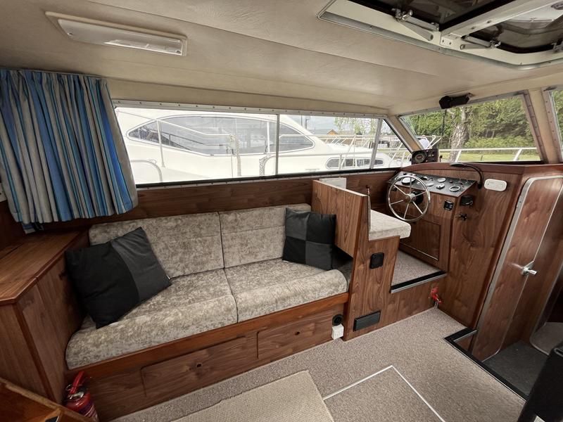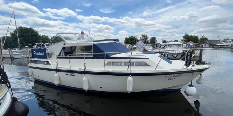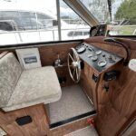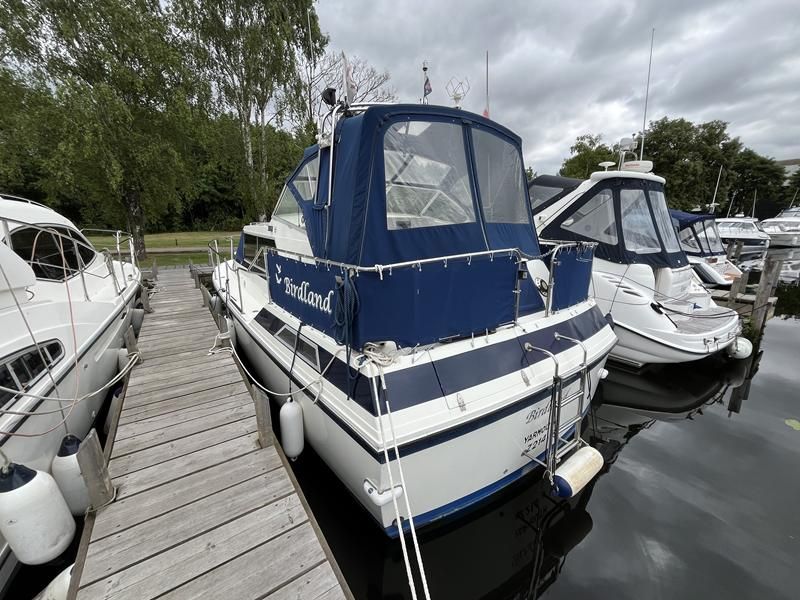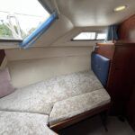 Broom 32 – 1983 (Commissioned 1984) – Powered by a 1.8ltr BMC Mermaid diesel engine through shaft. Up to 7 berth accommodation with two toilets and showers, including an aft cabin with en-suite facilities. Specification to include; Bow thruster, warm air heating, holding tank, hydraulic steering, shore power, battery charger, Waeco inverter, immersion heater/calorifier and more. Folding screens and radar arch for increased inland access. BSC 2027. A beautifully kept Broom 32, presented in its original gel coat, offering the perfect platform for family cruising.