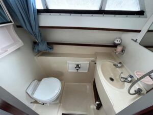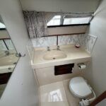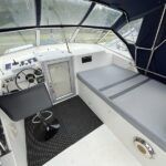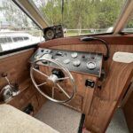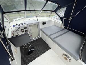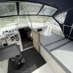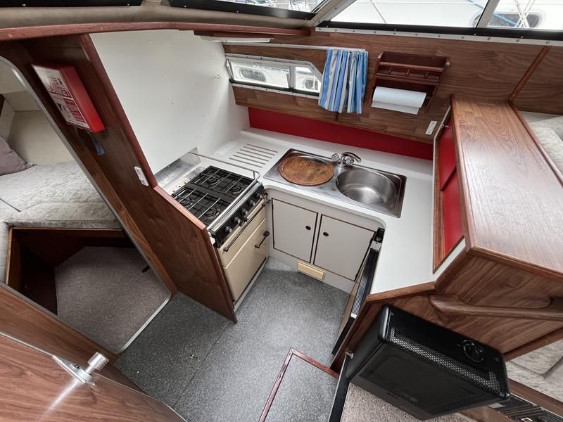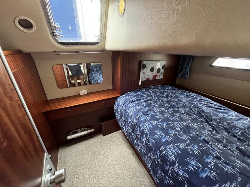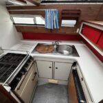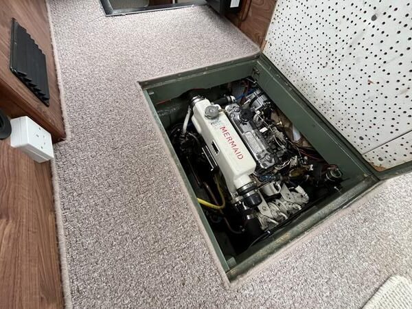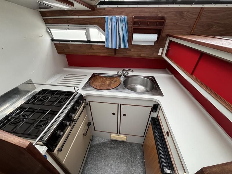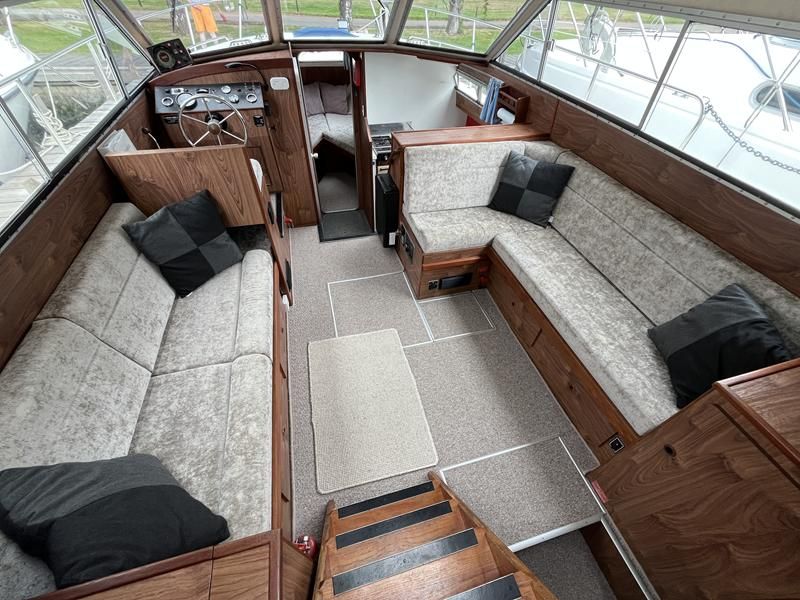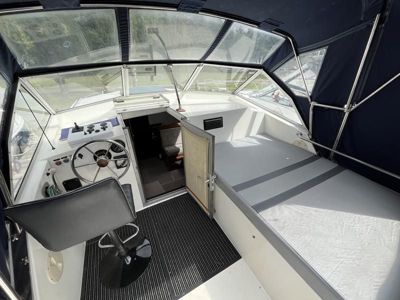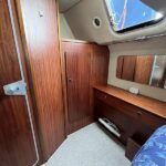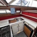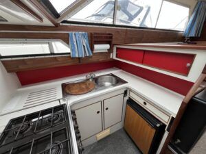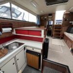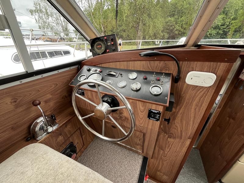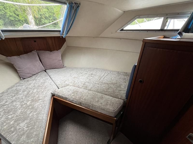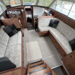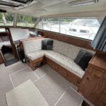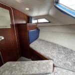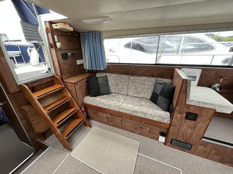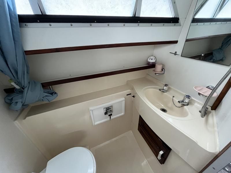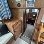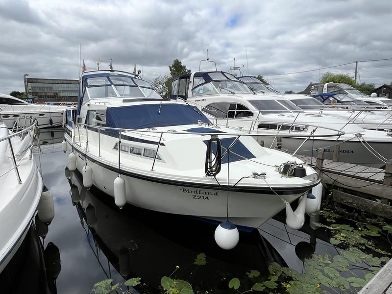 Broom 32 – 1983 (Commissioned 1984) – Powered by a 1.8ltr BMC Mermaid diesel engine through shaft. Up to 7 berth accommodation with two toilets and showers, including an aft cabin with en-suite facilities. Specification to include; Bow thruster, warm air heating, holding tank, hydraulic steering, shore power, battery charger, Waeco inverter, immersion heater/calorifier and more. Folding screens and radar arch for increased inland access. BSC 2027. A beautifully kept Broom 32, presented in its original gel coat, offering the perfect platform for family cruising.