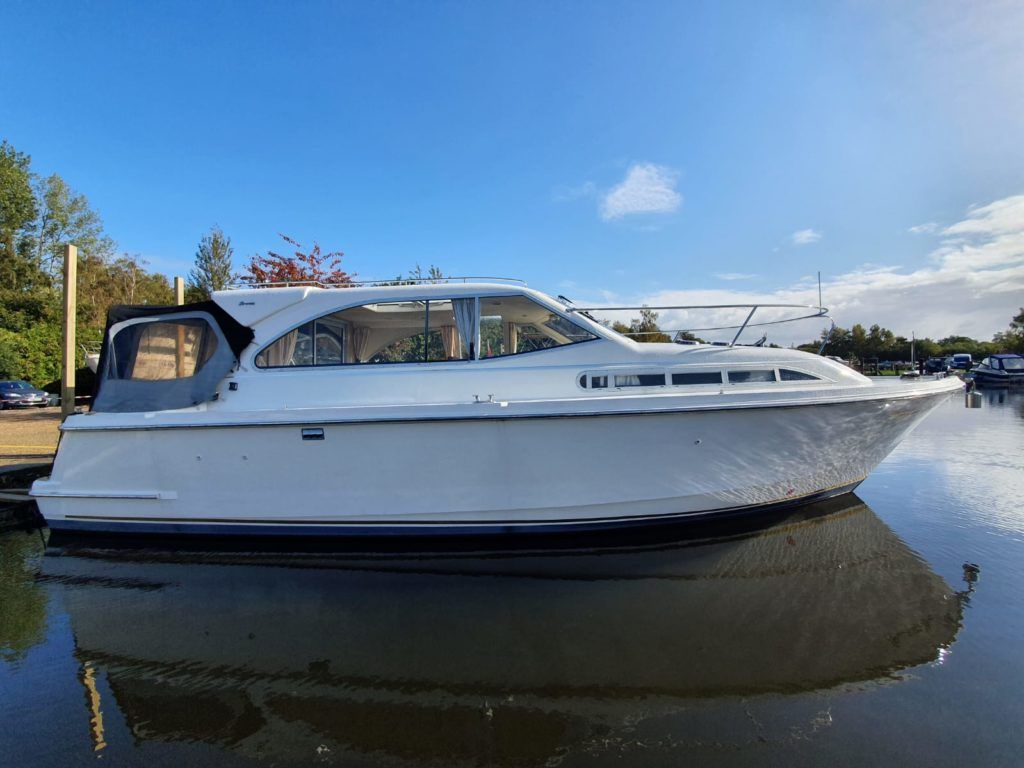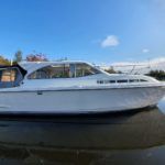 BROOM 34 SEDAN – 1997 – Powered by a single Perkins M90 diesel through a shaft – 4 berth accommodation with toilet and shower facility. Specification to include; Victron 1600 inverter, Vetus bowthruster, Eberspacher warm air heating, holding tank, shore power supply with 240v sockets, immersion and battery charger. Synthetic teak laid cockpit and bathing platform. Sliding side door and sunroof. Presented in very good order throughout. NYA Stock benefitting from a recent full machine compound and polish, antifoul and mechanical inspection by our Service Centre!