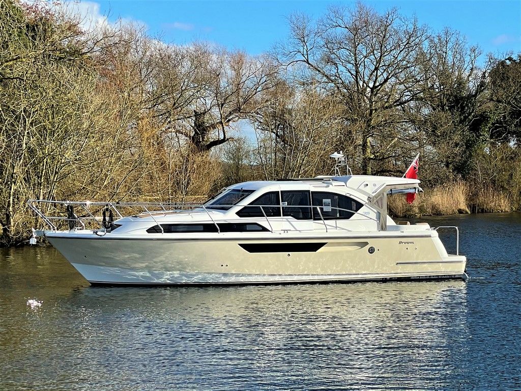 BROOM 35 COUPE – 2014 – Powered by a single Nanni N4.60 (60hp) diesel engine through a shaft. 4 berth accommodation with island double master cabin and further convertible double to saloon. 1 x toilet and shower compartment. Specification to include; Lewmar bowthruster, electric windlass, Victron 2000w inverter and battery charger, holding tank, Eberspacher warm air heating, electric sunroof, Fusion entertainment system, shore power. Synthetic teak laid bathing platform, cockpit and foredeck. NYA stock fully prepared by our Service Centre benefitting from an engine service 2021, new canopy 2021, full machine compound and polish, antifoul and mechanical inspection! A turn-key Broom 35 Coupe presented in fantastic order throughout.