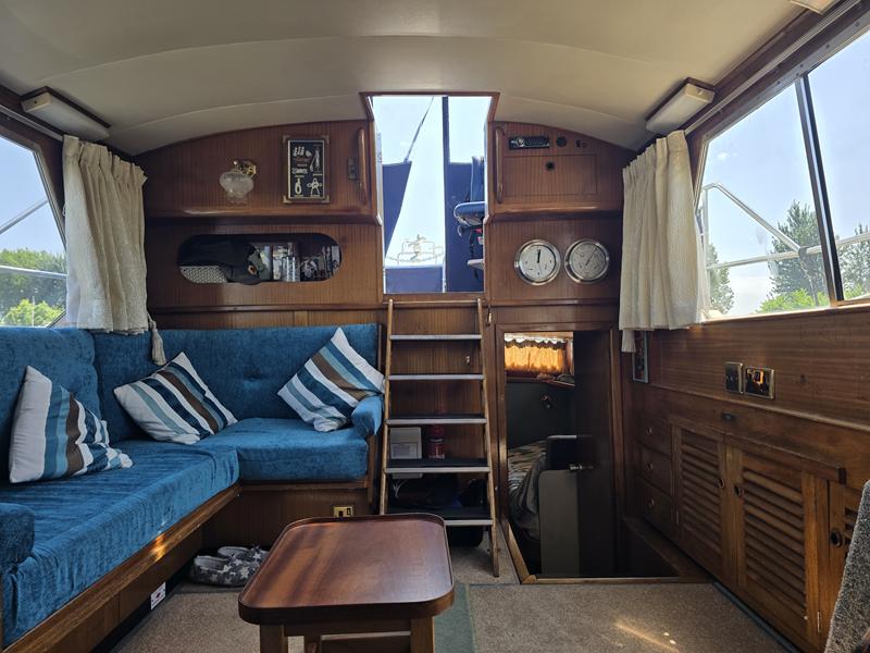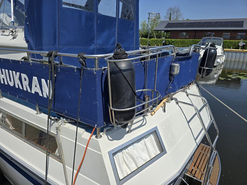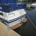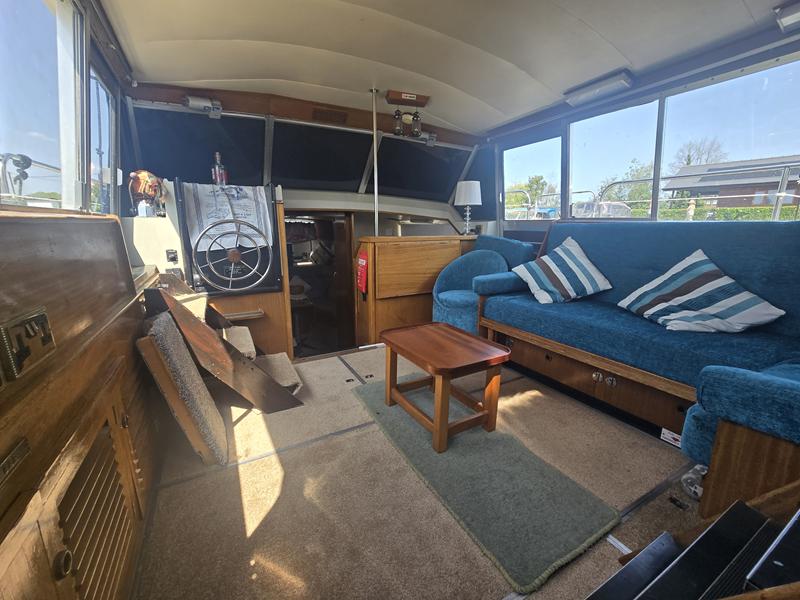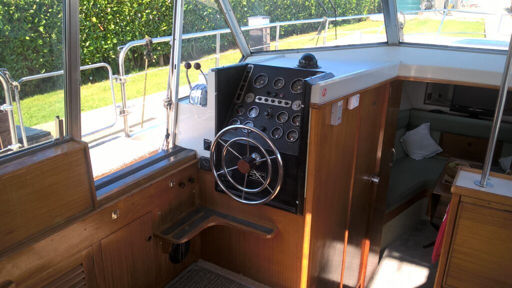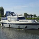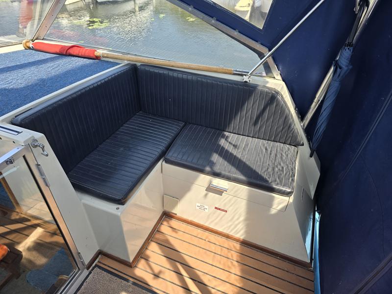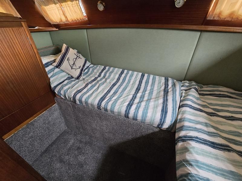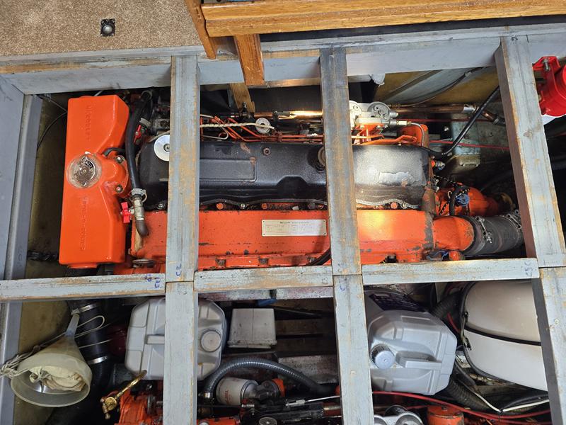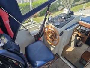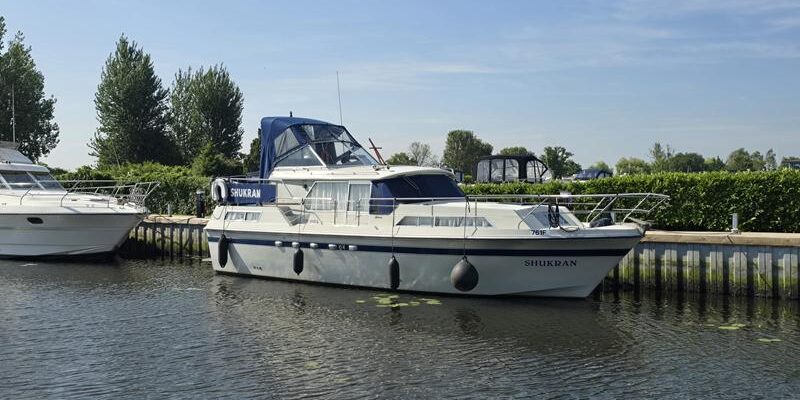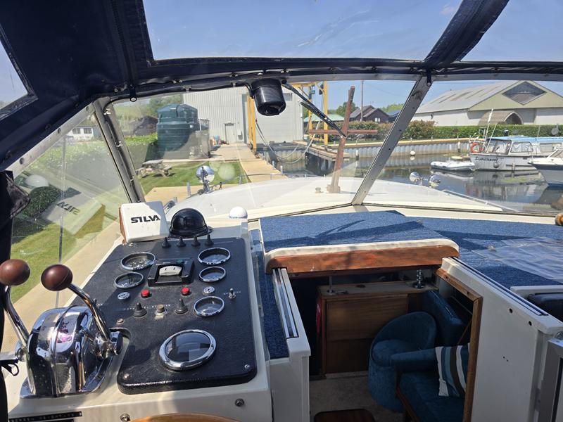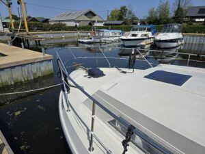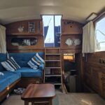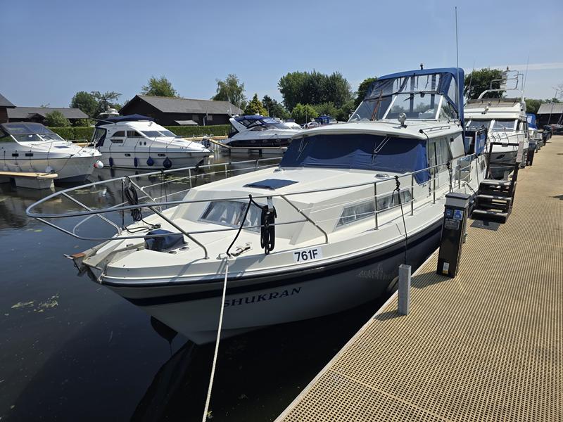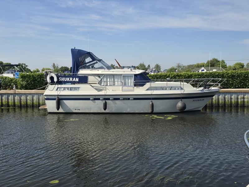 Broom 35 European – 1978 – 2x Ford Mermaid 120hp diesels through shafts – 6 berth accommodation with two toilets and shower facility – Specification to include; Diesel warm air heating, bow thruster, Pegasus 4000 generator, holding tank, VHF, shore power and battery charger. Engines serviced Nov 24. Folding arch and screens for increased inland access. BSC 2026. A well-specified Broom 35 with desirable non-turbo engines, perfect for extended inland cruising!