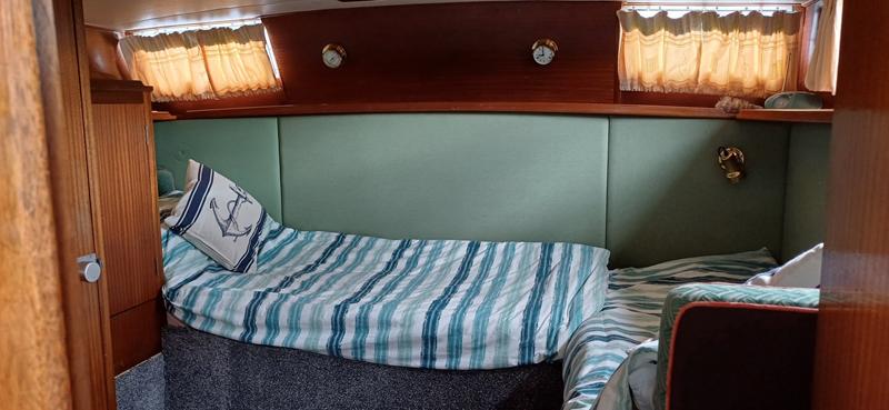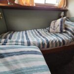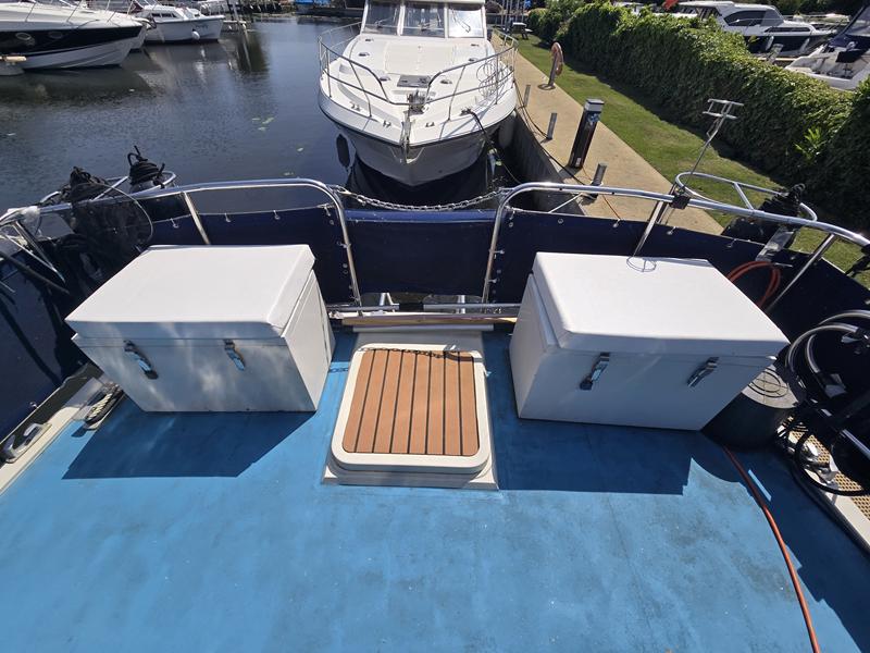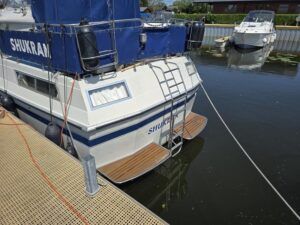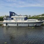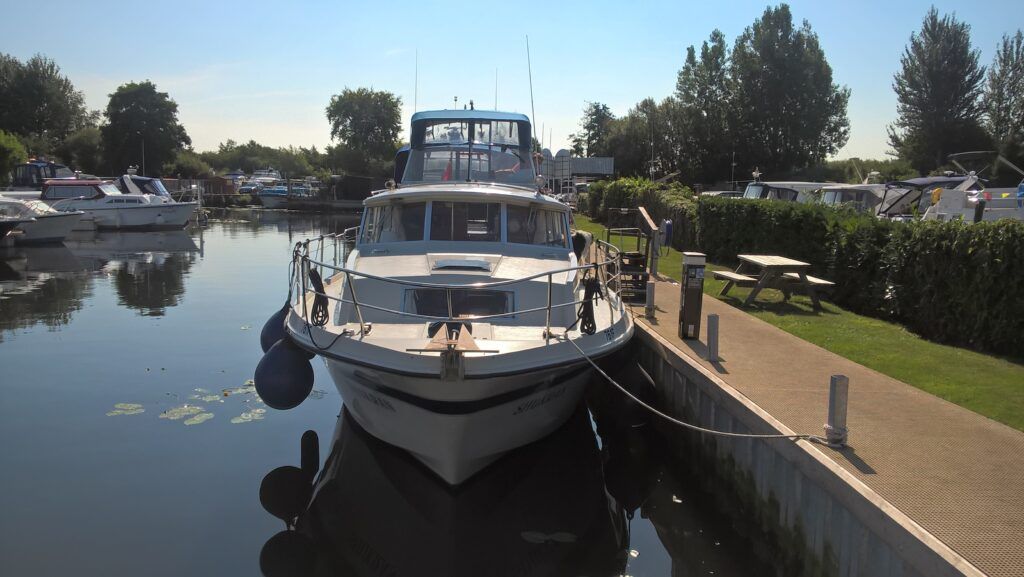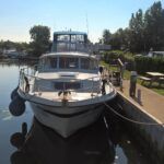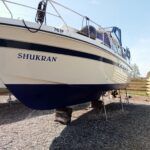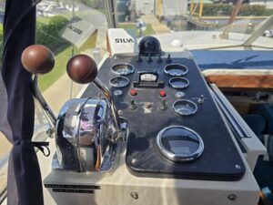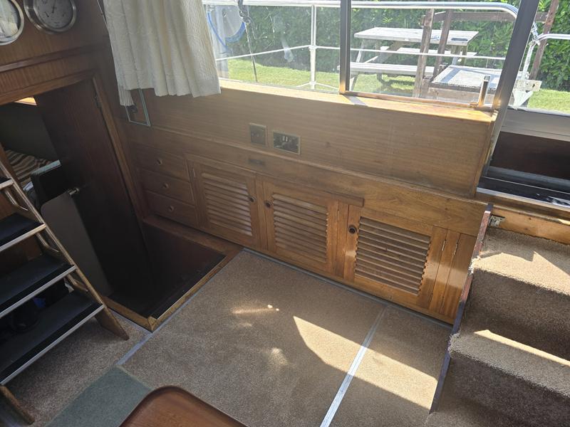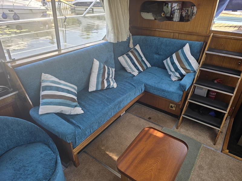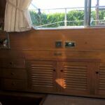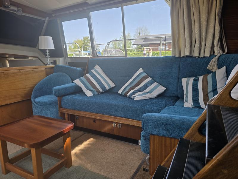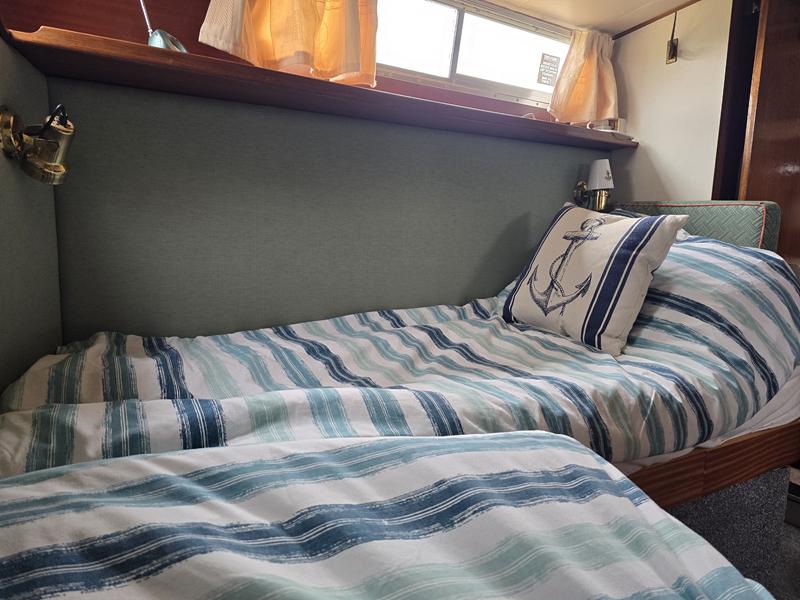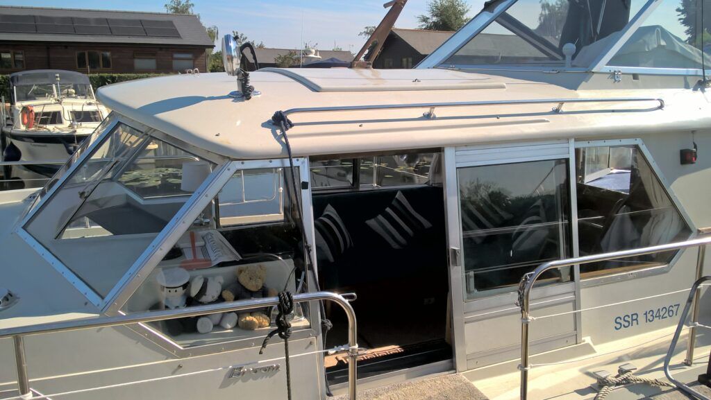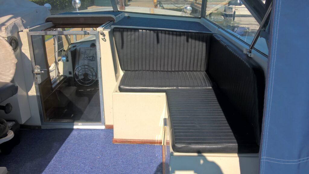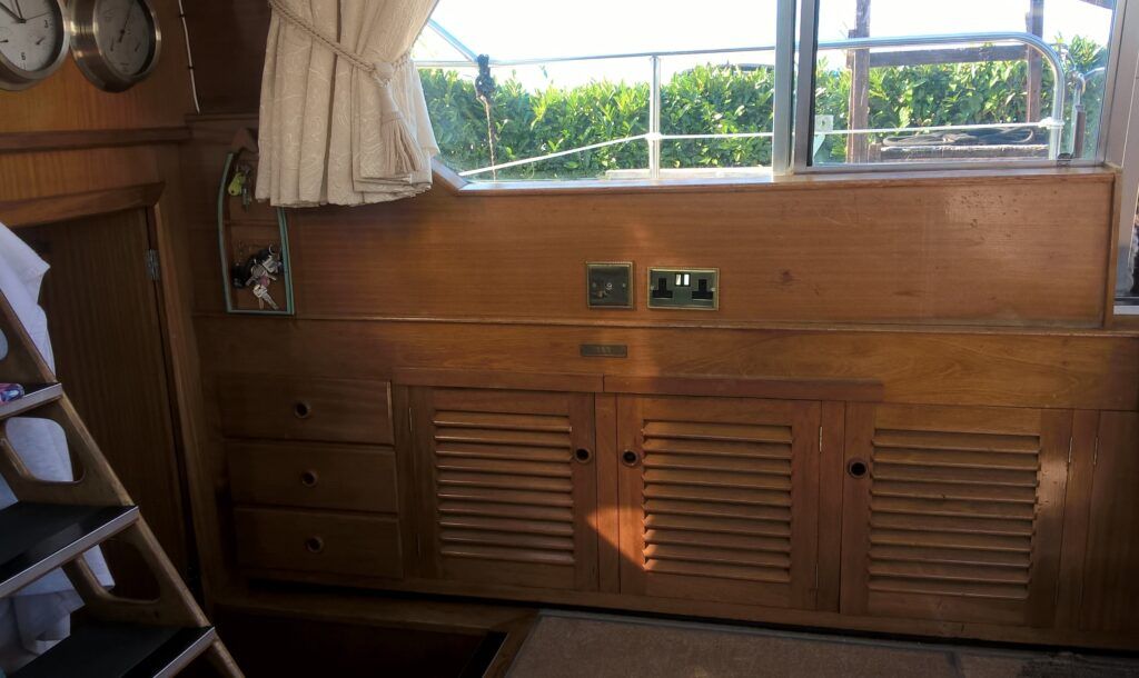 Broom 35 European – 1978 – 2x Ford Mermaid 120hp diesels through shafts – 6 berth accommodation with two toilets and shower facility – Specification to include; Diesel warm air heating, bow thruster, Pegasus 4000 generator, holding tank, VHF, shore power and battery charger. Engines serviced Nov 24. Folding arch and screens for increased inland access. BSC 2026. A well-specified Broom 35 with desirable non-turbo engines, perfect for extended inland cruising!