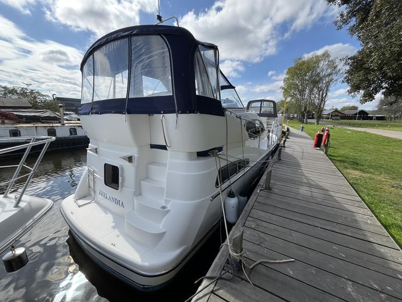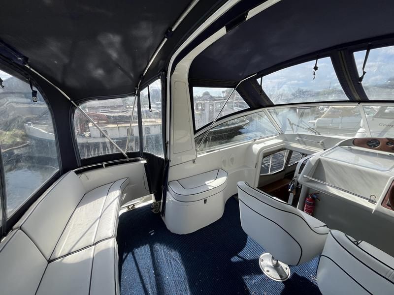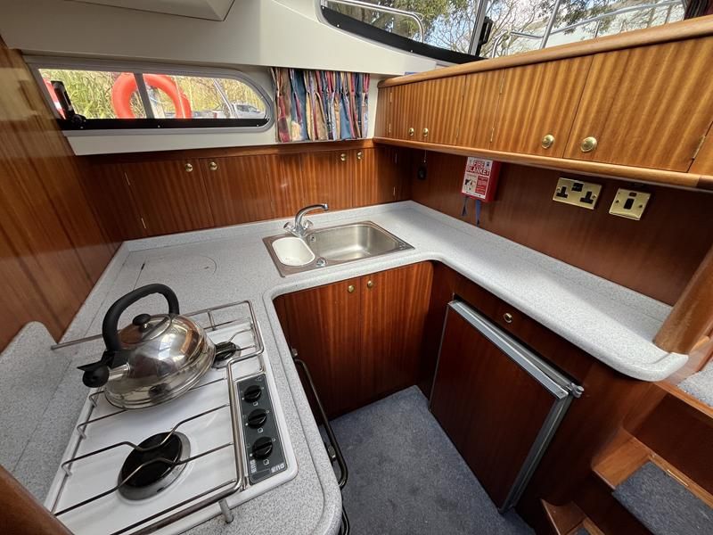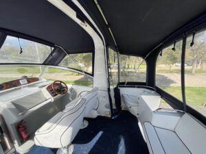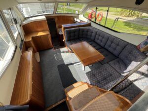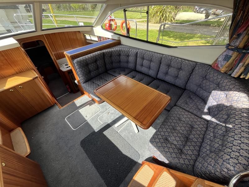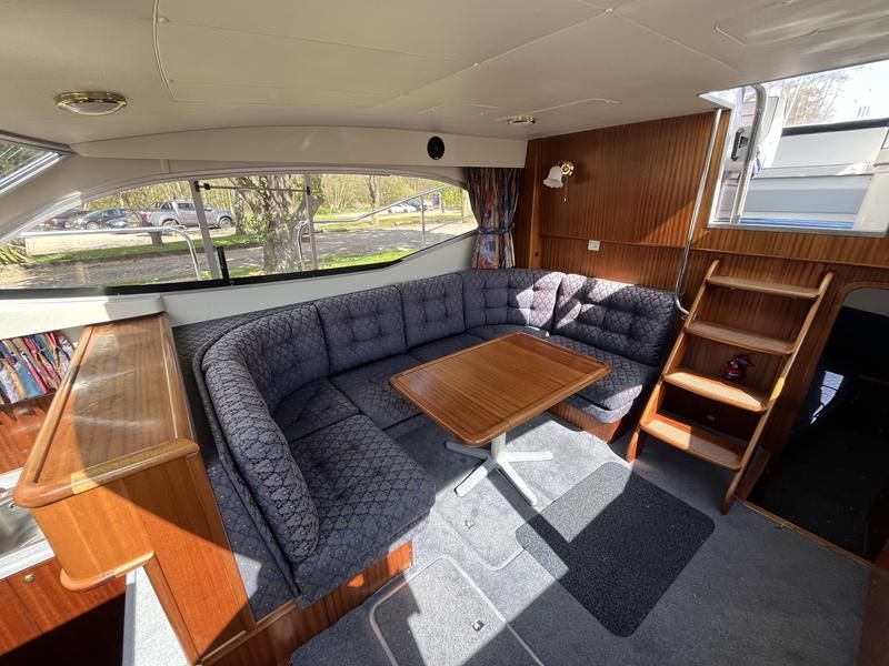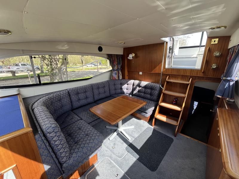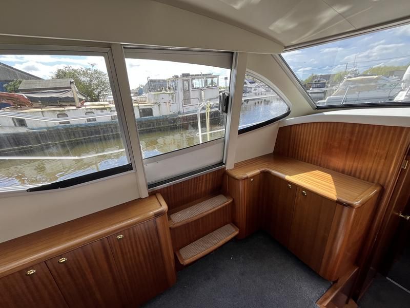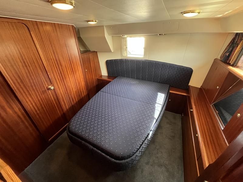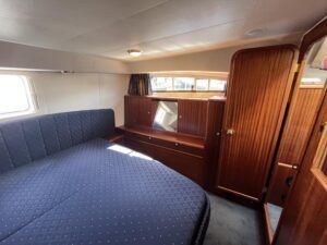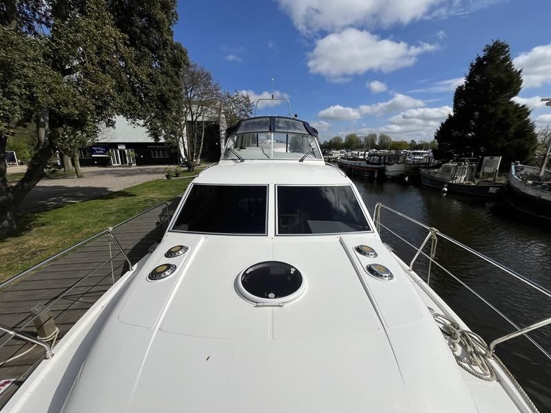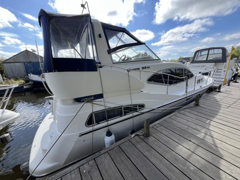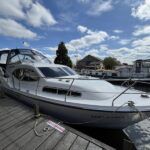 Broom 35CL – 1999 – Powered by a Perkins Sabre M135 (135hp) diesel engine through shaft. Spacious 4 berth accommodation with two toilet compartments, master en-suite shower. Specification including bow and stern thrusters, shore power, battery charger, immersion heater, warm air heating, anchor winch, electric aft toilet, folding arch for increased inland access, BSC 03/28. A popular model in the Broom range boasting a large island double en-suite master cabin, comfortable and economical cruising.