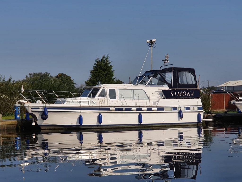 BROOM 37 CONTINENTAL – Built in 1975 – Powered by twin diesel Perkins 145hp diesels through shafts. 6 berth accommodation in 2 cabins with 2 toilet and shower facility. Specification to include remote Sidepower bow and stern thrusters, Webasto warm air heating, shore power supply with 240v sockets and immersion, calorifier, Garmin GPS, battery charger. BSC 04/23. Engines serviced 2019. A great family cruiser, spacious and comfortable with a good specification!