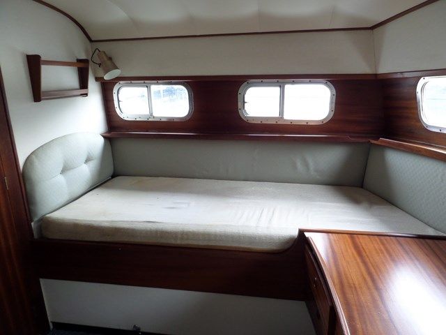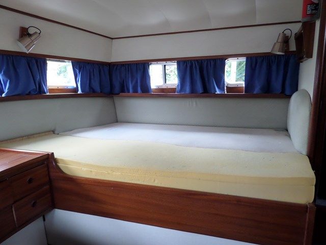 BROOM 37 CONTINENTAL – 1976 – Twin Perkins HT6354 Diesel engines. 6 Berths in 2 cabins. 2 x sea toilets and showers. Shore power, folding windscreens, Rinnai water heater, teak aft deck. A versatile cruiser suited for sea work and offering a low air draft which is perfect for more sedate river cruising. Hull polished and antifouled in 2013.