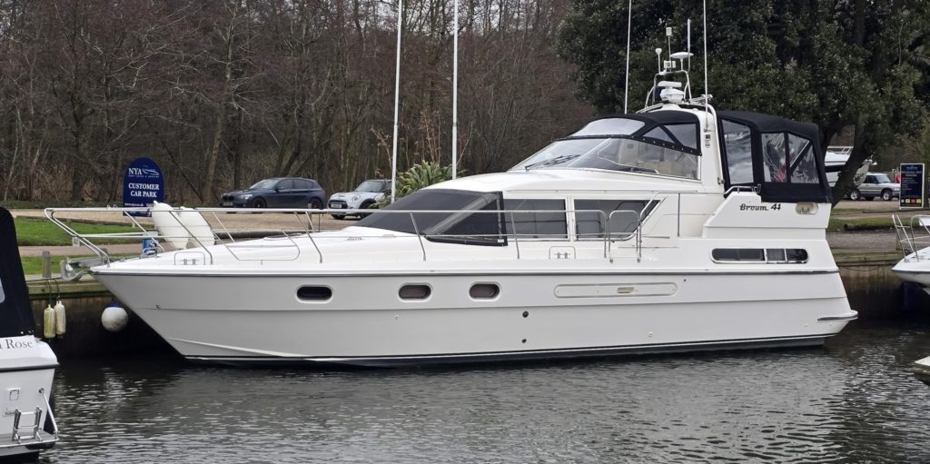 Broom 41 – 1998 – 2 x Perkins Sabre 300hp diesels through shafts. Six berth accommodation with two toilets and two showers. Well specified including; Bow and stern thrusters with remote, electric windlass, warm air heating, generator, trim tabs, Raymarine Axiom, autopilot, folding radar arch, teak laid cockpit, holding tank and much more! A true standout Broom 41, believed to be the last of the 41’s built, enhanced with many modern upgrades. Viewing highly recommended!