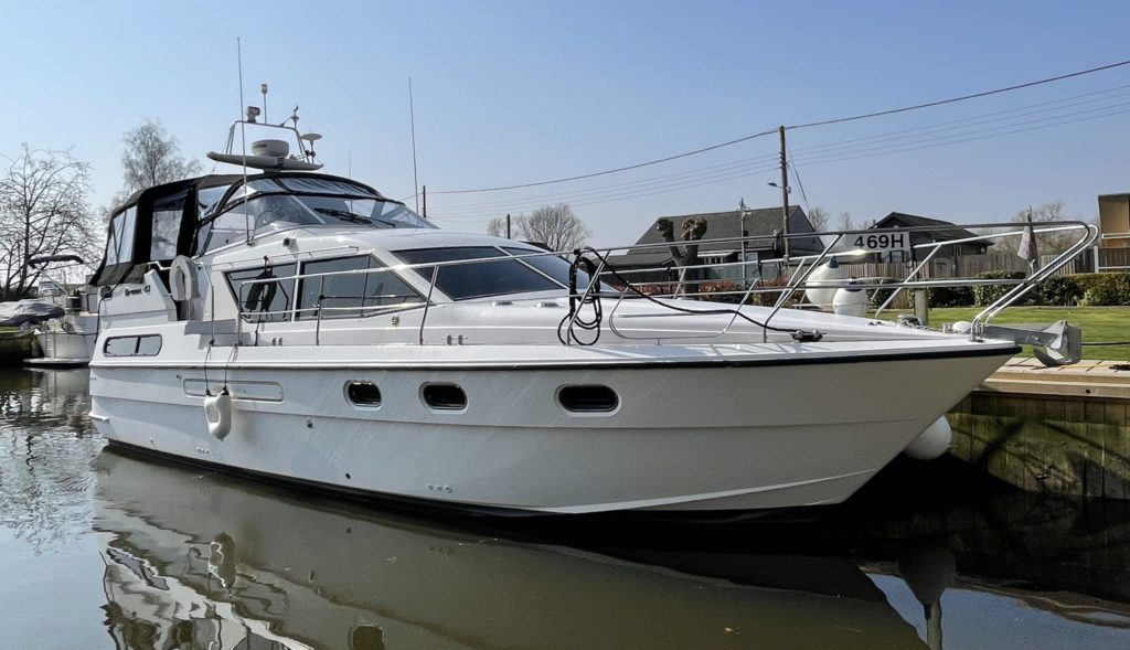 Broom 41 – 1992 – 2 x Perkins Sabre M300Ti 300 hp diesel engines (serviced August 2021), boasting two large cabins with en-suite the Broom 41 is without doubt a comfortable offshore cruiser. Libre is a well equipped vessel including: – Eberspacher heating, bow and stern thrusters, two Raymarine plotter/radar, autopilot, VHF, electric windlass, BSC expires 2025, leather saloon upholstery, as you would expect from a Broom she is beautifully finished throughout.