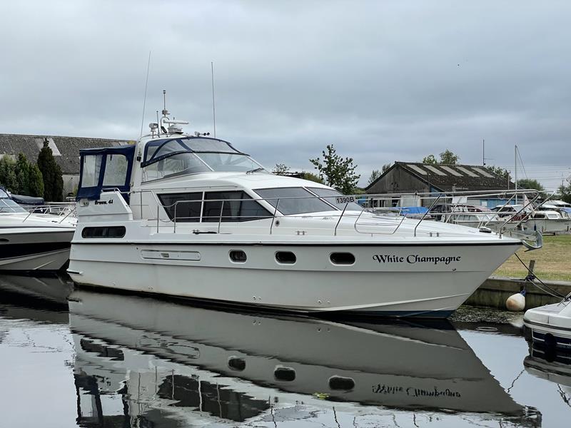 Broom 41 – 1996 – 2 x Volvo TAMD63L 318hp diesel engines through shafts. Boasting two large cabins with en-suite facilities, master cabin with island double and separate shower cubicle. A well equipped vessel including: – Vetus bow thruster, Fisher Panda generator, Lewmar electric windlass, shore power, battery charger, immersion, warm air heating, Raymarine C70 chart plotter, Furuno radar, Autohelm ST700 autopilot, ICOM IC-M59Euro VHF, BSC expires 2025. The Broom 41 is without doubt a comfortable and capable offshore cruiser.
