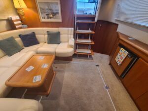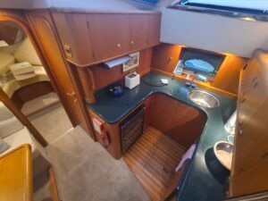 Broom 415 – 2001 – Powered by 2 x Caterpillar 3126 355hp diesel engines through shafts. Up to 6 berth accommodation over 2 cabins and saloon with 2 x toilet/shower compartments. island aft berth, spacious saloon, Specification including bow thruster, 4kw generator, electric windlass, warm air heating, shore power, battery charger, immersion, hinged radar arch, Boat Safety Certificate until May 2029. A lovely example of these very capable offshore cruisers.