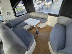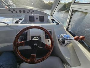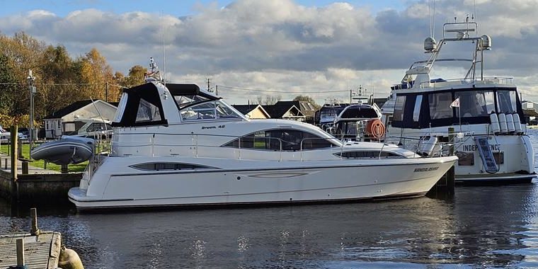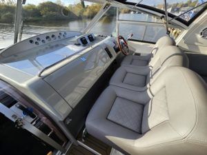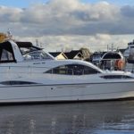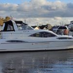 Broom 42 – 2001 – Powered by 2 x Yanmar 6LP-STE 300hp diesel engines through shafts. 6 berth accommodation with two toilets & two showers. Well specified including; 4kw Generator, warm air heating, electric winch, air conditioning, shore power with battery charger, holding tank with diverter, bow thruster, autopilot, upgraded Raymarine navigation equipment. Hydraulic radar arch for increased inland access. ‘Kandalashka’ features numerous upgrades and benefits from meticulous maintenance.